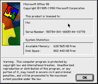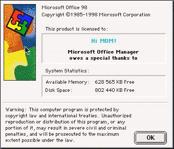 Les vieux sites font référence à Office Manager, mais ce n’est pas un programme très documenté. Après quelques recherches, je suis tombé sur ce que je cherchais : c’est un tableau de bord pour Mac OS qui permet de lancer les applications de Microsoft Office. J’ai d’abord tenté avec la version 9.0, distribuée en ligne en parallèle de Microsoft Office 2001, mais l’Easter Egg n’est dans cette version. Donc je suis passé sur la version de Microsoft Office 98. Elle est sur le CD-ROM d’installation, dans Office Custom Install -> Installer Files -> Microsoft Office Manager. Une fois dans le bon dossier et après un redémarrage, ça a fonctionné.