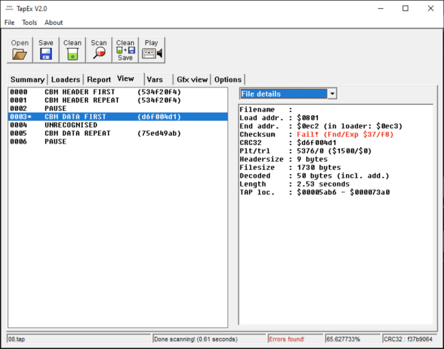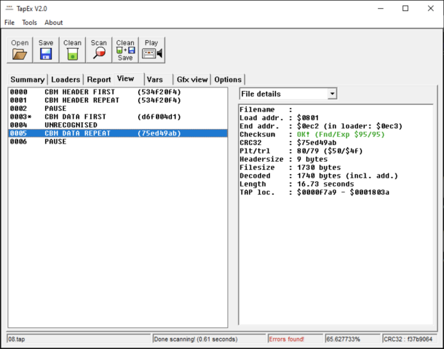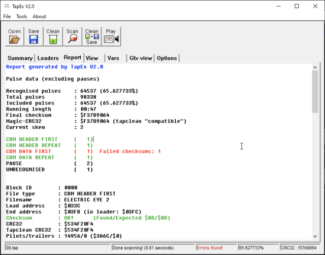 Le second m’a donné plus de mal. Il est sur l’autre face et est plus long (environ 40 secondes). J’ai fait pas mal d’essais sans réussir à charger le programme, mais c’est TapEx V2.0 qui m’a sauvé. Le programme est vraiment plus efficace que les autres. Comme pour Cracker’s Revenge, mon enregistrement n’est pas parfait. Mais comme pour Cracker’s Revenge, ça passe tout de même : les enregistrements pour Commodore 64 contiennent les données en double. Donc si une des deux copies ne fonctionne pas, ça passe tout de même.