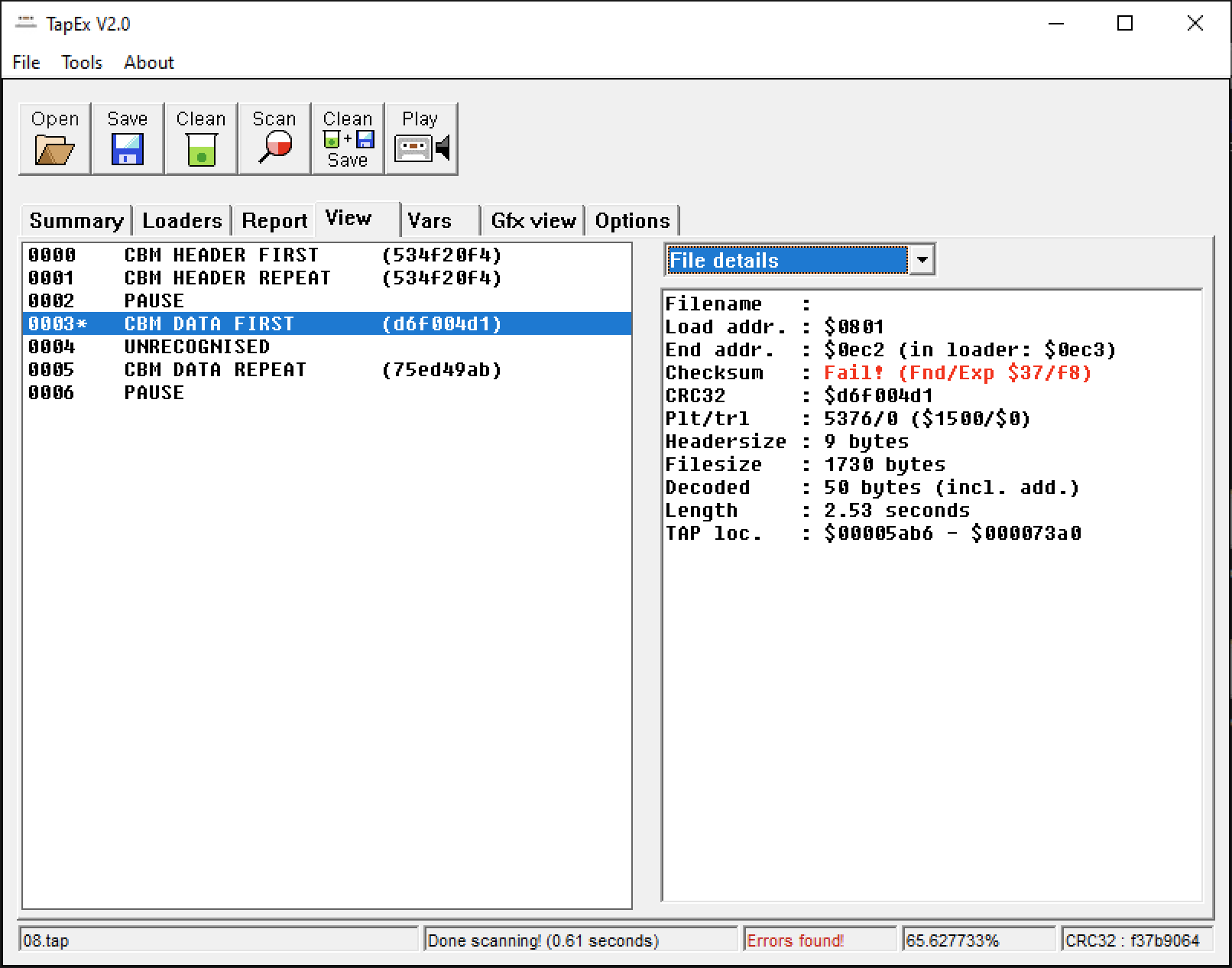 Le second m’a donné plus de mal. Il est sur l’autre face et est plus long (environ 40 secondes). J’ai fait pas mal d’essais sans réussir à charger le programme, mais c’est TapEx V2.0 qui m’a sauvé. Le programme est vraiment plus efficace que les autres. Comme pour Cracker’s Revenge, mon enregistrement n’est pas parfait. Mais comme pour Cracker’s Revenge, ça passe tout de même : les enregistrements pour Commodore 64 contiennent les données en double. Donc si une des deux copies ne fonctionne pas, ça passe tout de même.