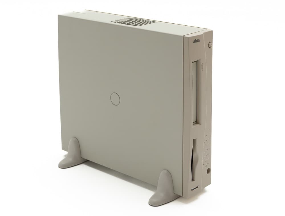 Akia proposait des clones de Mac en 1997/1998. ce sont des modèles assez classiques sur le plan technique, mais le boîtier compact est intéressant tout de même. Il peut être placé horizontalement ou verticalement. On peut voir une alimentation compacte, des prises classiques (série, ADB, SCSI, vidéo en DA-15) et une carte mère Umax. C’est une Typhoon, qui dérive de l’Alchemy d’Apple vue dans certains Power Macintosh. Il y a un PowerPC 603e sur un bus à 40 MHz, de la mémoire en DIMM, deux PCI (sur une équerre) et de l’IDE. Le vendeur avait aussi un modèle avec quelques accessoires, comme une carte vidéo supplémentaire.