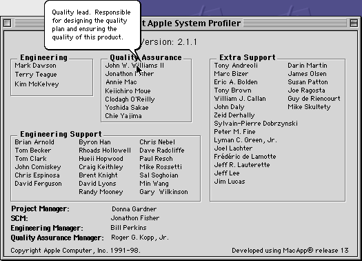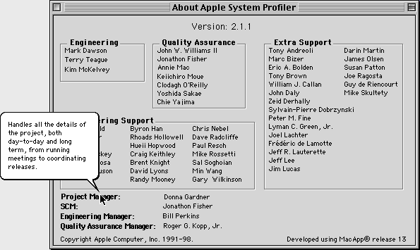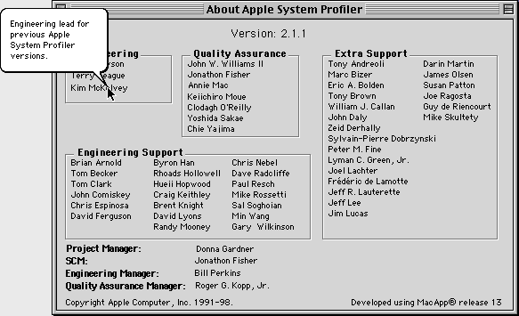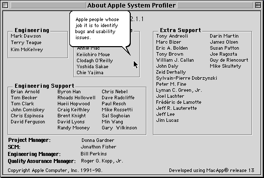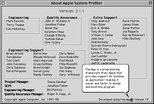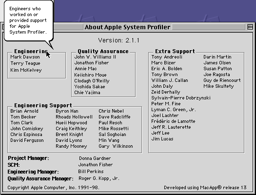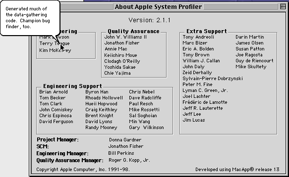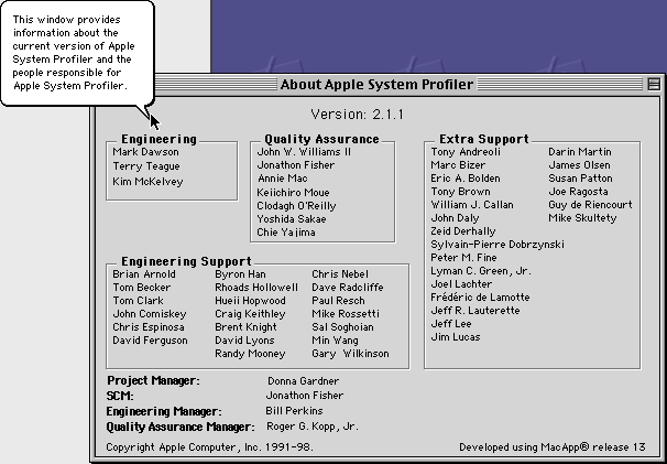 This window provides information about the current version of Apple System Profiler and the people responsible for Apple System Profiler.
