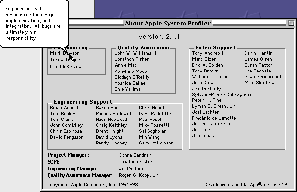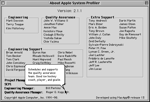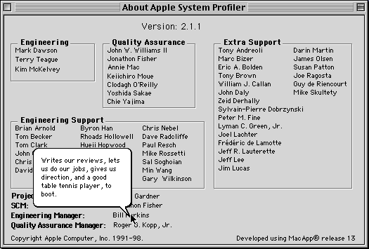 Un petit Easter Egg dans Informations système Apple, le logiciel d’Apple qui donne des informations sur un Macintosh. Il y a des bulles d’aide qui affiche des explications et des anecdotes sur certains des développeurs.