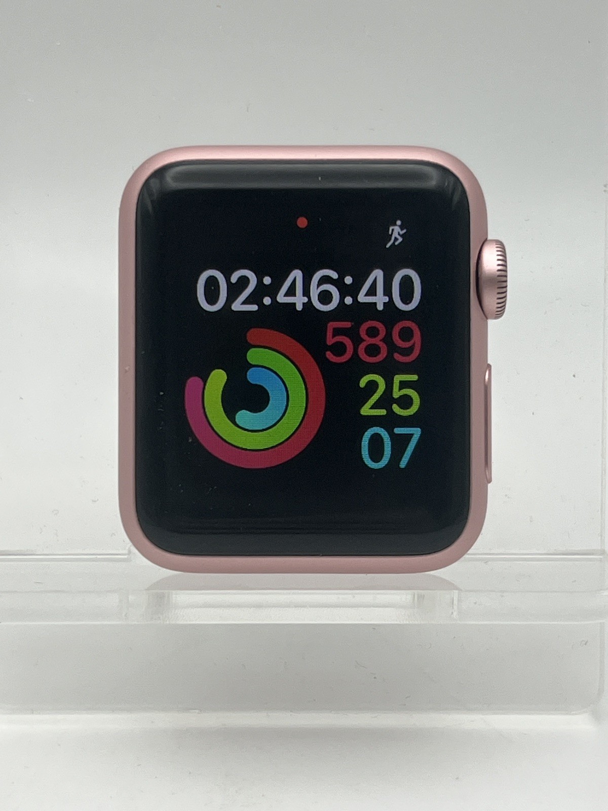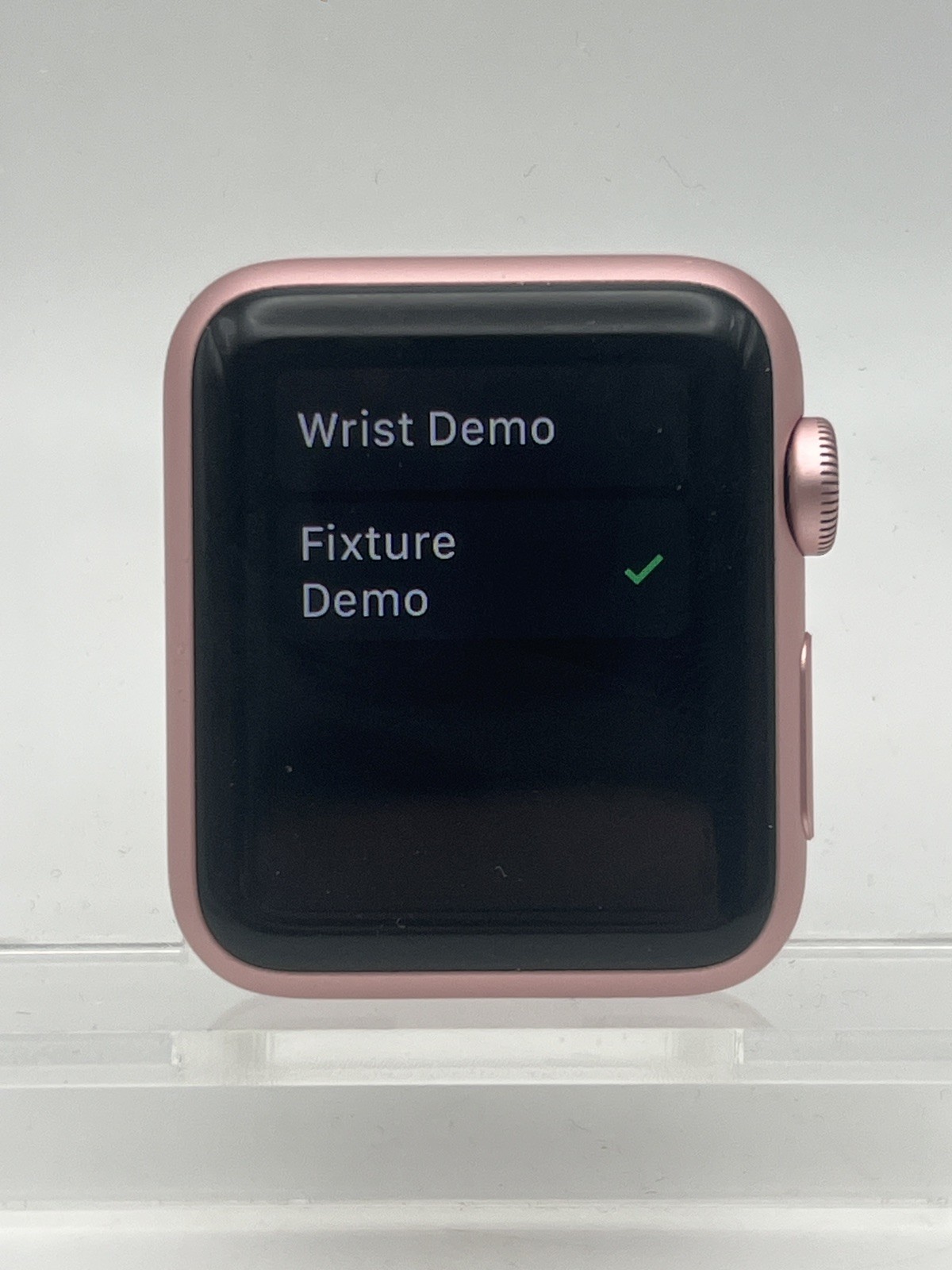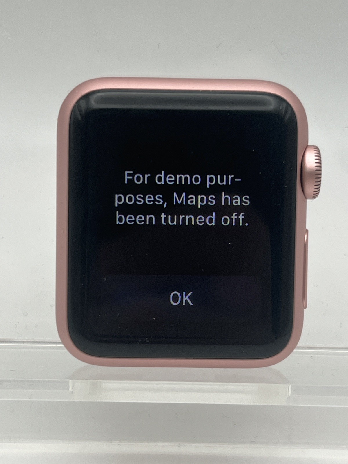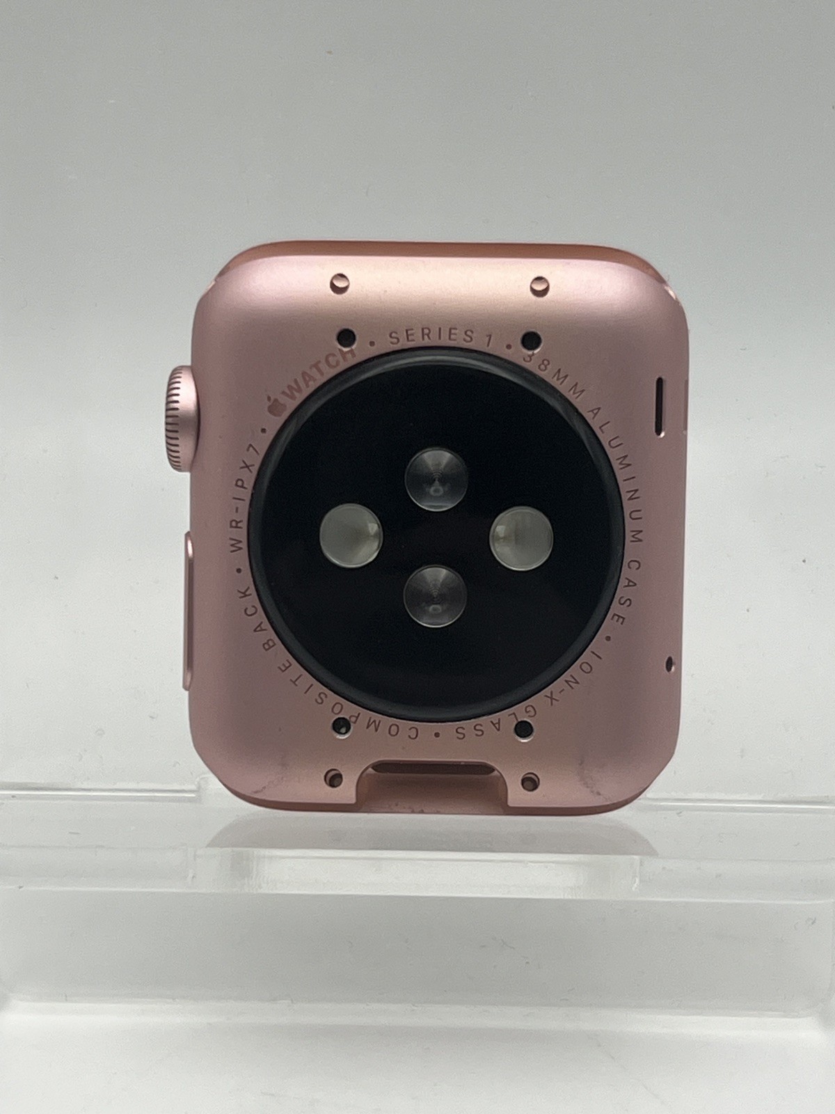 C’est une Apple Watch 38 mm rose, avec la coque découpée à l’arrière. On peut voir les trous pour les vis de fixation. Habituellement, les modèles qui se fixent sur les iPad mini sont des 42 mm en acier de la première génération, ici on est sur la seconde génération, en aluminium et dans le modèle le plus petit.