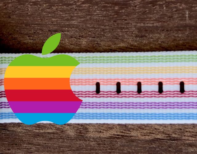 Vu sur X, un prototype de bracelet d’Apple Watch aux couleurs du vieux logo d’Apple.