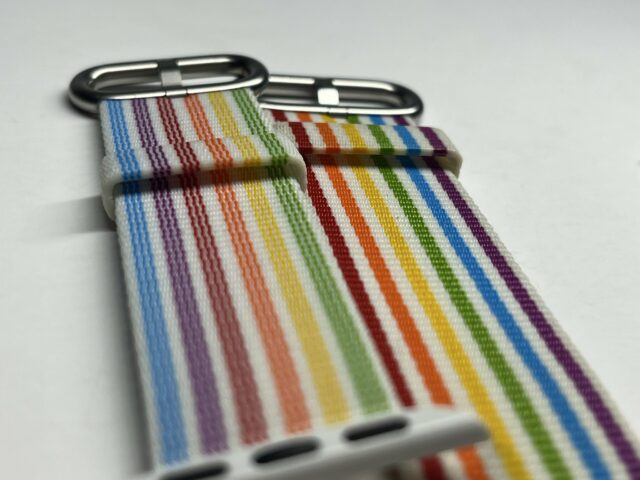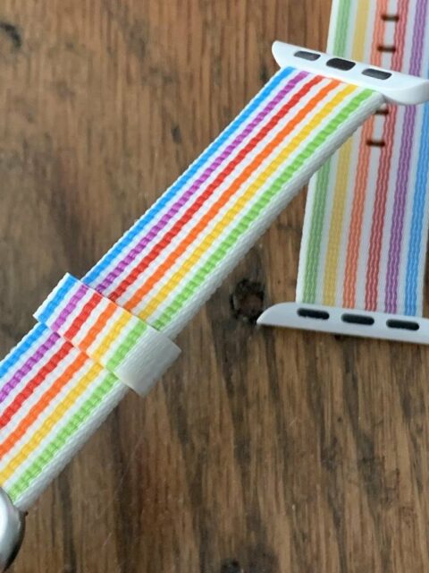 C’est un nylon tressé, assez proche du modèle de la collection Pride de 2018. La différence principale, c’est que l’ordre des couleurs n’est pas le même : au lieu du drapeau LGBT dans sa version six bandes (🏳️🌈), c’est le logo d’Apple. On a donc vert, jaune, orange, rouge, violet et bleu. Son propriétaire pense qu’Apple avait peut-être imaginé proposer le bracelet pour les 40 and du Mac, en 2024.