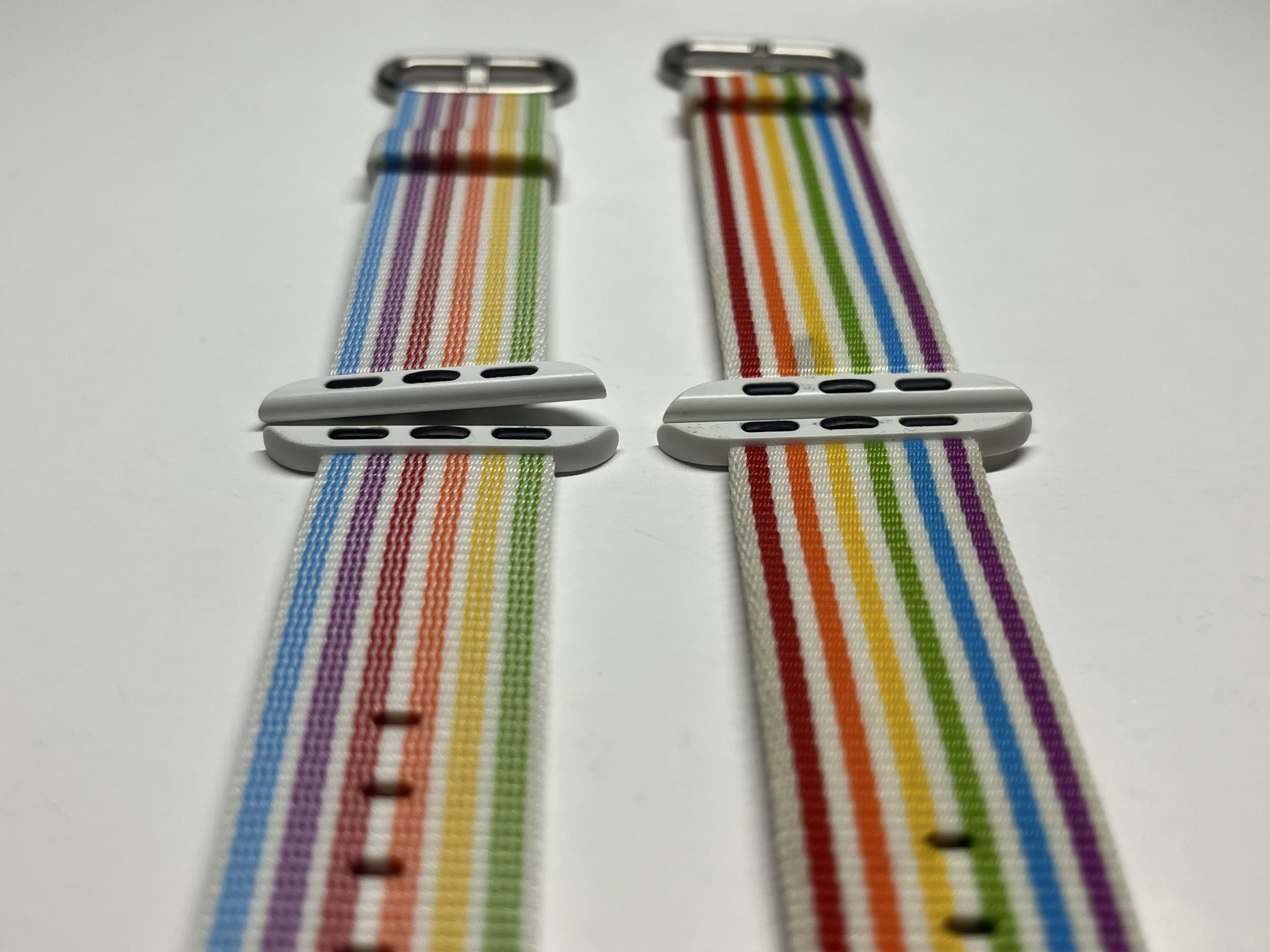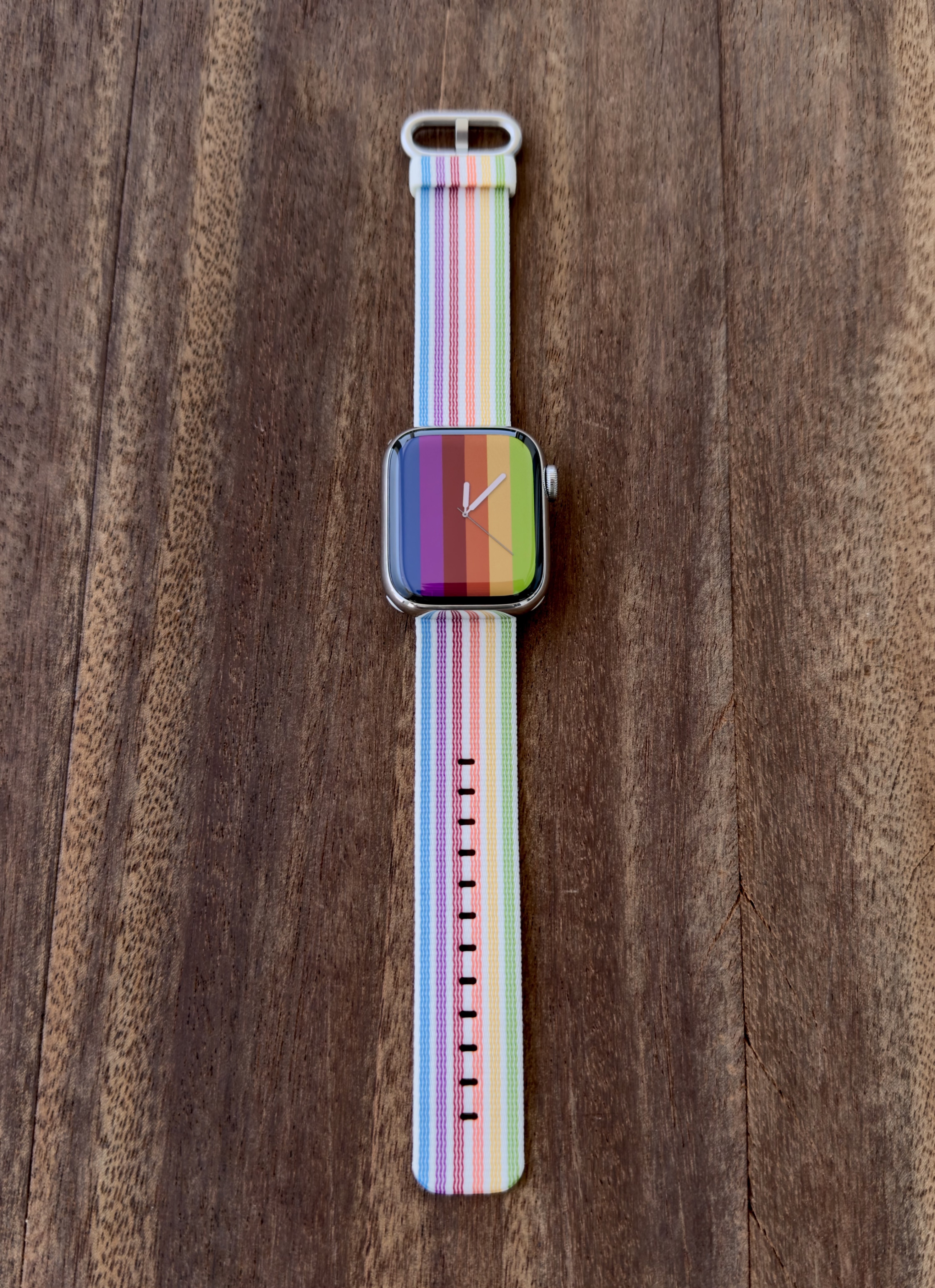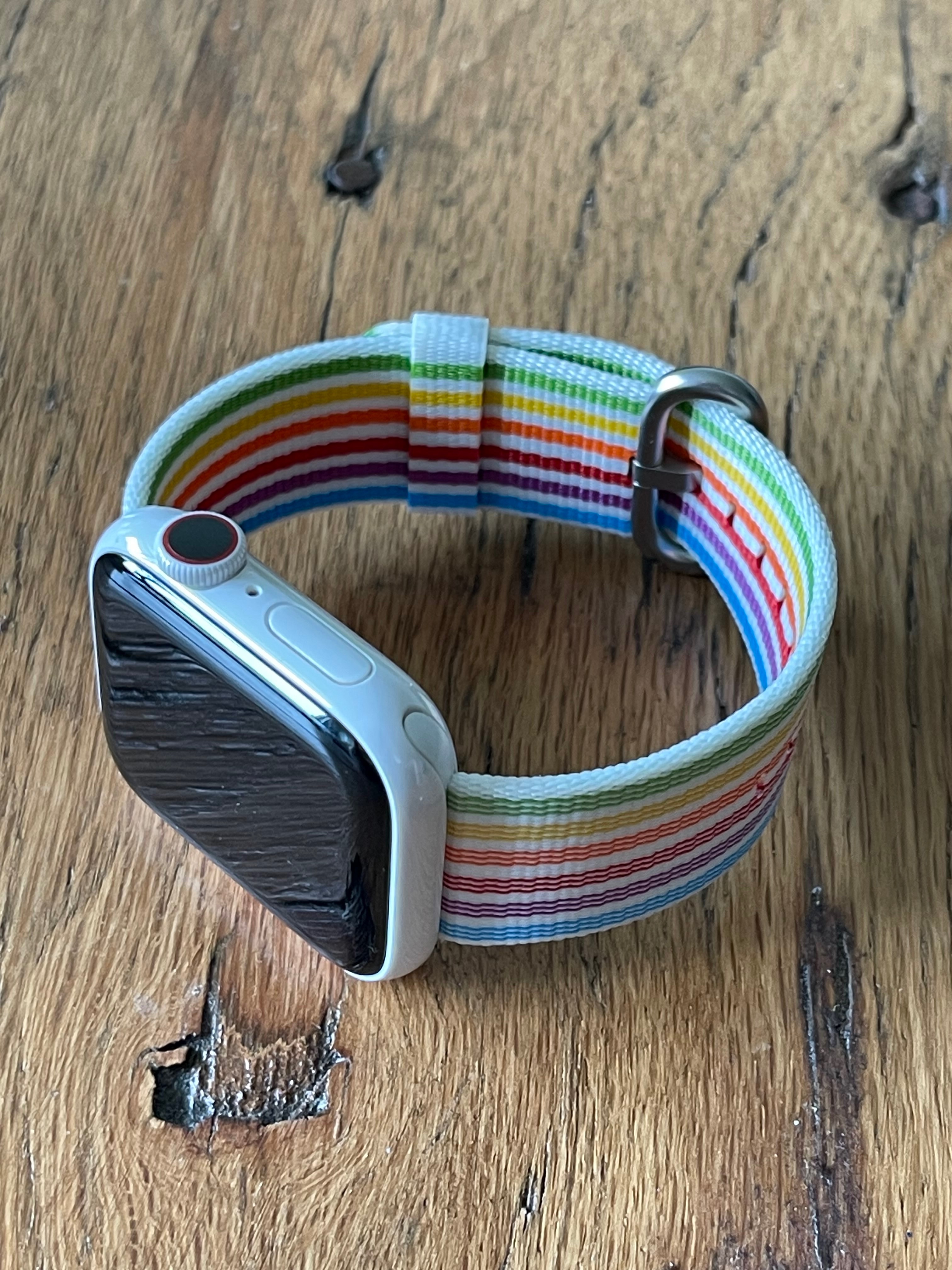 C’est un nylon tressé, assez proche du modèle de la collection Pride de 2018. La différence principale, c’est que l’ordre des couleurs n’est pas le même : au lieu du drapeau LGBT dans sa version six bandes (🏳️🌈), c’est le logo d’Apple. On a donc vert, jaune, orange, rouge, violet et bleu. Son propriétaire pense qu’Apple avait peut-être imaginé proposer le bracelet pour les 40 and du Mac, en 2024.