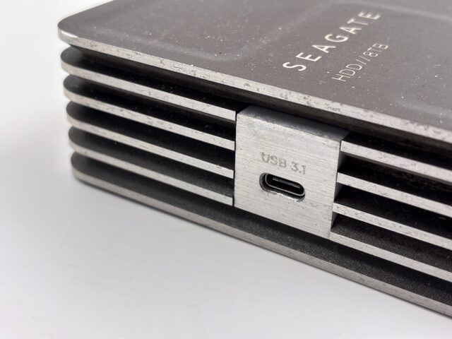 Physiquement, c’est un gros boîtier : 20,8 x 12,3 x 3,6 cm pour 1,49 kg. Il est plus large et plus long qu’un modèle classique chez Seagate, et (surtout) pèse bien plus lourd. Un autre disque dur externe de la même marque que j’avais dans un tiroir pèse par exemple 857 grammes. Il est en aluminium, avec une esthétique assez sympathique : un empilement de tranches de métal. Si la prise USB-C – il n’a pas d’entrée pour une alimentation externe – est réversible, ce n’est pas le cas du disque dur. Il est presque symétrique, mais Seagate a tout de même mis des pieds sous le disque dur.