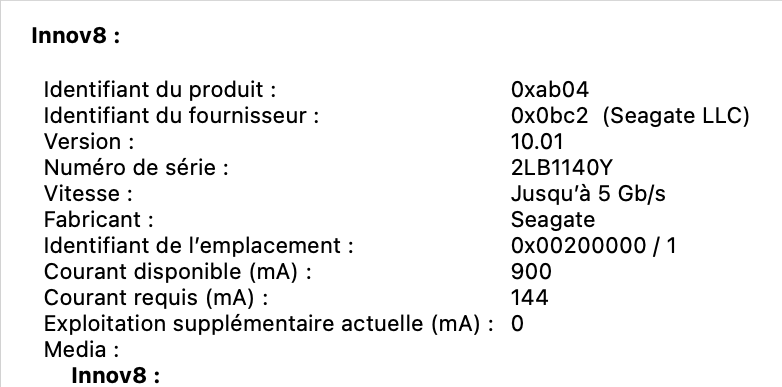 Au-delà de la batterie, Seagate triche un peu et c’est aussi un défaut. macOS m’indique que le disque dur fonctionne avec une intensité de 900 mA et nécessite 144 mA (0,7 W) mais en pratique, la consommation est beaucoup plus élevée. Au repos, il est sur des valeurs de cet ordre, mais le simple fait d’accéder à son contenu monte la valeur à 2,6 A (13 W) et il se stabilise vers 1,5 A (7,5 W) quand on navigue dans le disque, quand on l’utilise ou pendant un benchmark.