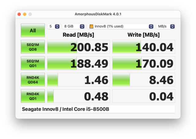 Avant de passer à l’USB-C et ses défauts, un mot sur les performances. C’est un disque dur de 8 To en USB 3.1 à 5 Gb/s, une norme qui permet environ 440 Mo/s au mieux. Au passage, il ne fonctionne pas en USB 2.0 ni avec une prise USB-A (il a besoin de la négociation pour démarrer). Comme c’est un disque dur et qu’il n’est pas tout neuf, on reste largement sous cette valeur : environ 200 Mo/s en lecture (c’est très honnête), 140 Mo/s en écriture – quand il est vide – et des valeurs très faibles sur les accès aléatoires. C’est logique, ça reste un disque dur qui tourne à 5 900 tpm, donc le temps d’accès est élevé. Seagate, à l’époque, a utilisé un disque dur de la gamme Archive, c’est-à-dire un modèle SMR.