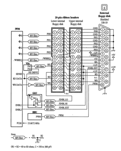 Et cette possibilité rare nécessite visiblement une puce dédiée sur la carte mère, comme le montre la capture des schémas du Macintosh SE. Il y a une discussion sur les forums de 68KMLA, mais en gros le contrôleur SWIM des Mac ne gère directement que deux lecteurs, et un composant avec un peu de logique (GLU) est présent sur les cartes mères des Macintosh SE et Macintosh Portable pour prendre en charge le troisième lecteur.