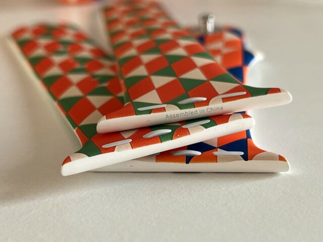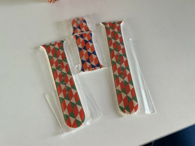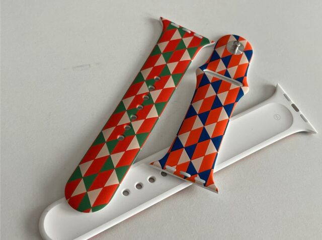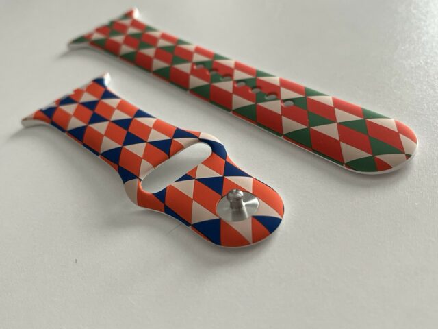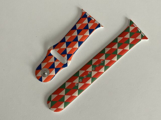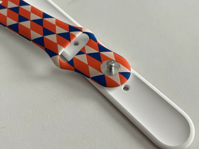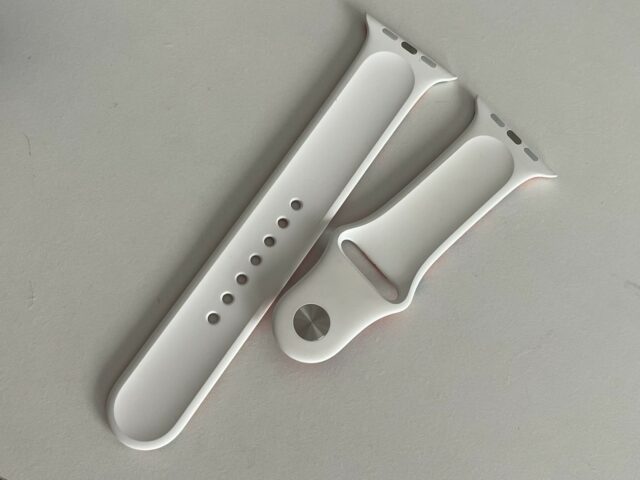 Il pointe que le marquage est exactement celui d’Apple (M/L et S/M), que l’impression a visiblement été faite avant l’insertion des clous, que l’impression est de très bonne qualité, que le bracelet a été livré avec deux morceaux (S/M, M/L), ce qu’Apple faisait à l’époque (plus actuellement) et que l’emballage est le même que les bracelets de test d’Apple. De même (il a plutôt l’habitude des bracelets), il indique que le rendu est bien celui d’un modèle Apple, mais l’impression tend à indiquer que ce n’est pas un modèle Apple blanc imprimé a posteriori.