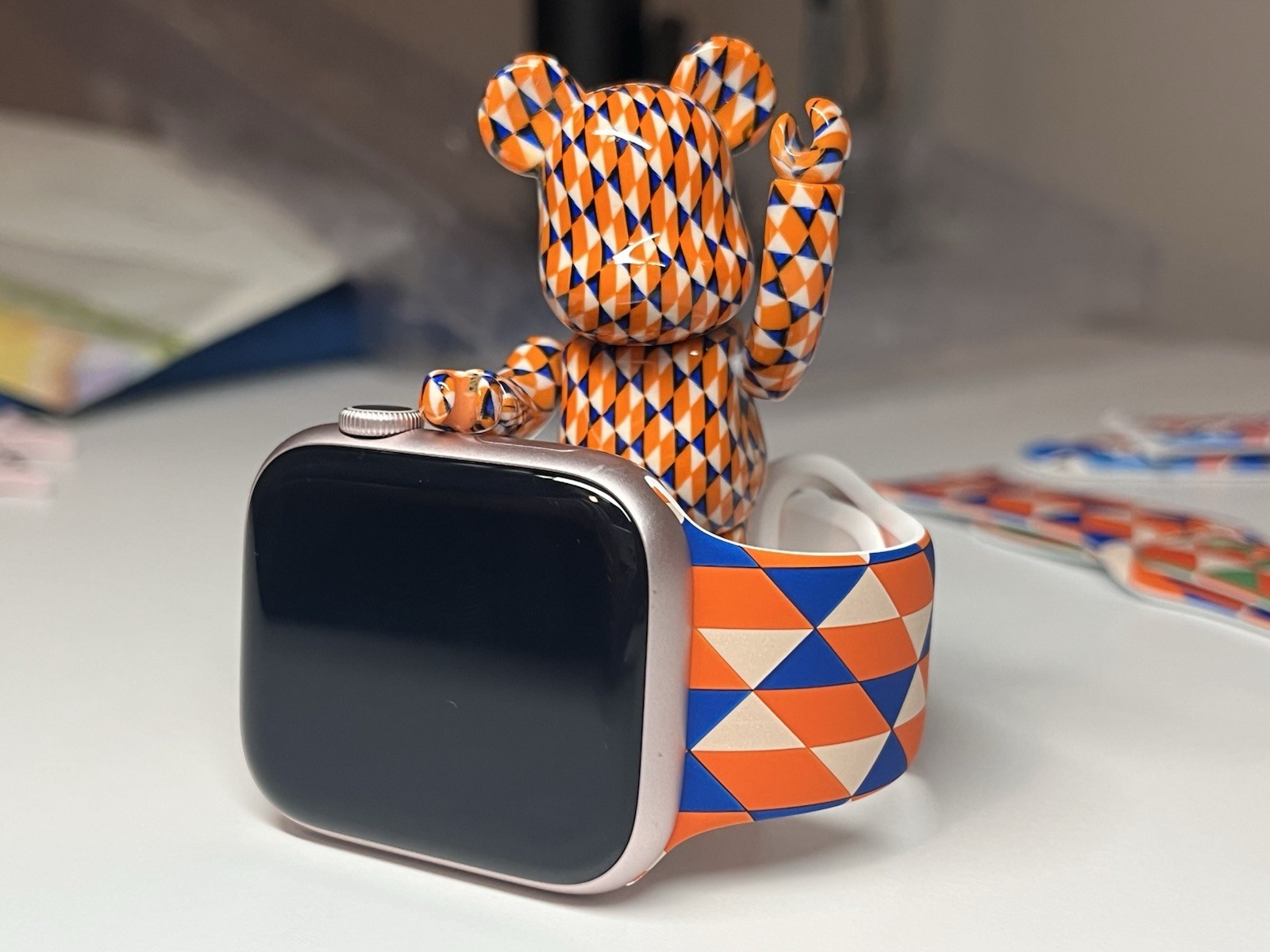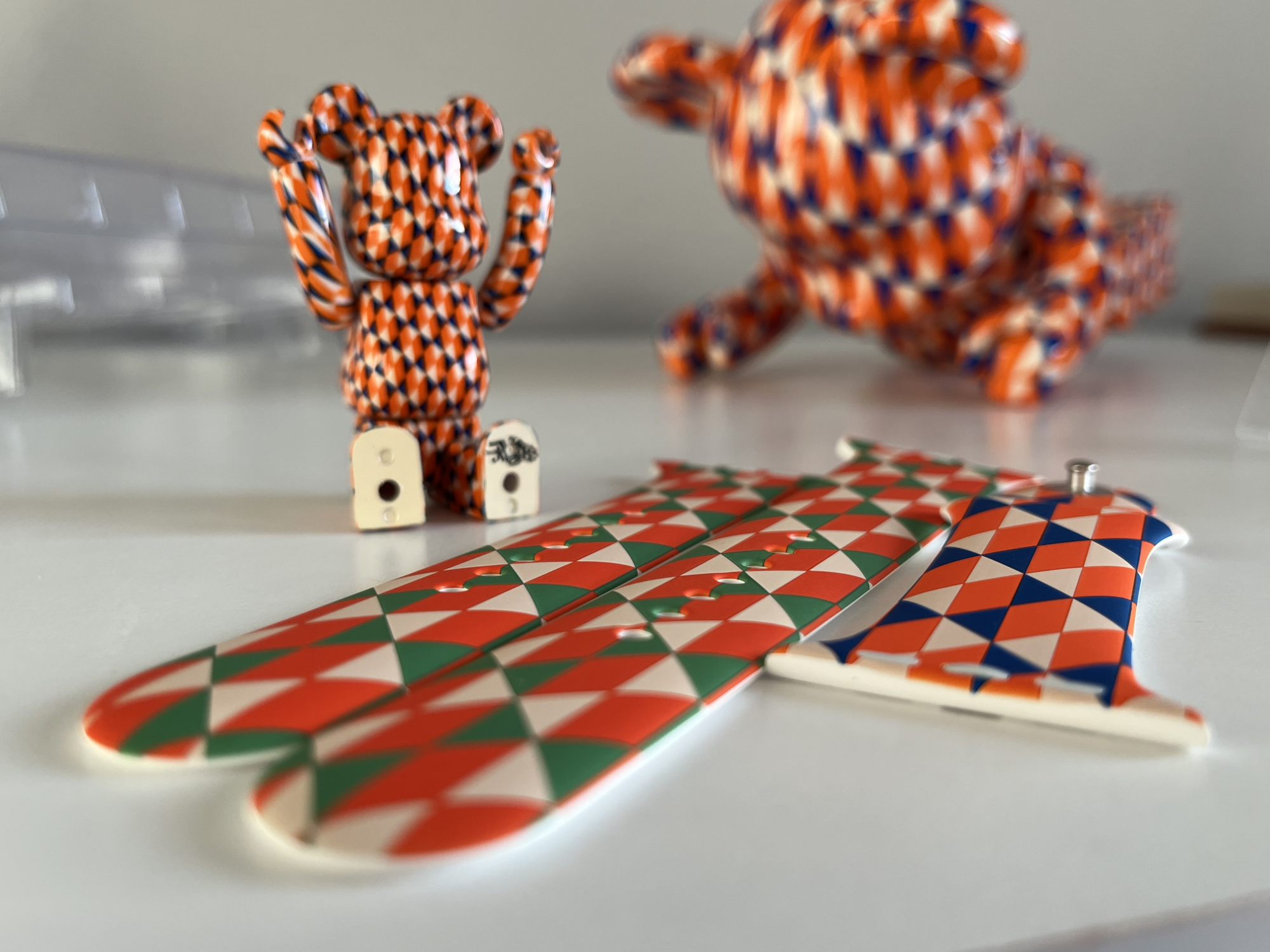 Les Bearbrick, ce sont des ours assez connus, souvent décorés par des artistes. Barry McGee, c’est artiste qui a justement proposé un Bearbrick. Et il était livré avec un bracelet d’Apple Watch, un modèle Sport de 42 mm de l’époque (vers 2018). Et selon la personne qui vend un bracelet (et qui argumente bien sur les forums de MacRumors), c’est en réalité un bracelet Apple sans que ce soit officiel.