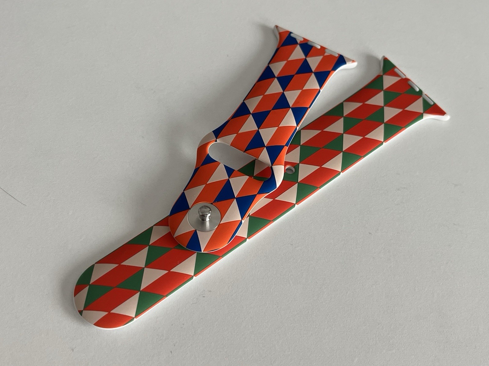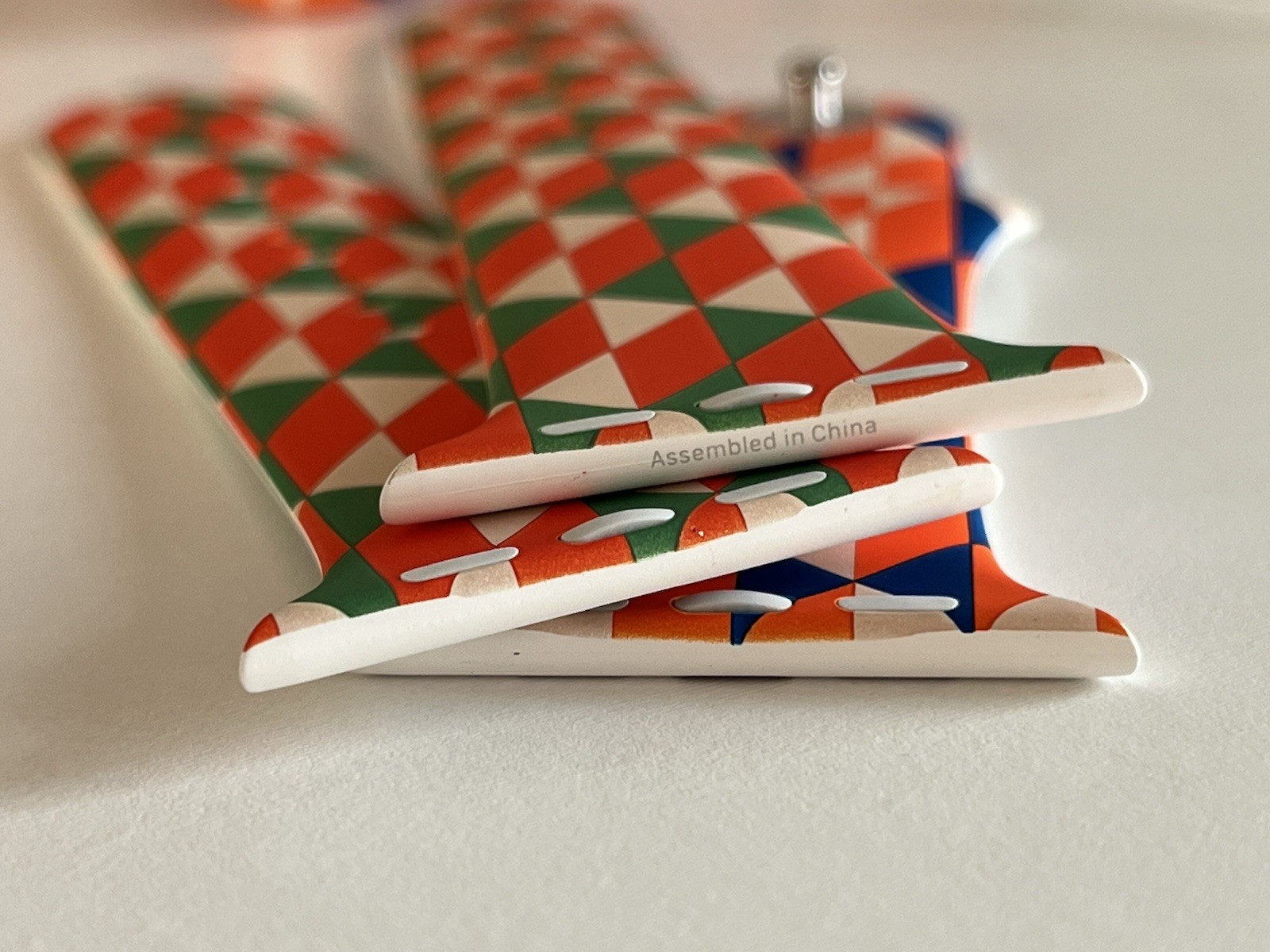 Il pointe que le marquage est exactement celui d’Apple (M/L et S/M), que l’impression a visiblement été faite avant l’insertion des clous, que l’impression est de très bonne qualité, que le bracelet a été livré avec deux morceaux (S/M, M/L), ce qu’Apple faisait à l’époque (plus actuellement) et que l’emballage est le même que les bracelets de test d’Apple. De même (il a plutôt l’habitude des bracelets), il indique que le rendu est bien celui d’un modèle Apple, mais l’impression tend à indiquer que ce n’est pas un modèle Apple blanc imprimé a posteriori.