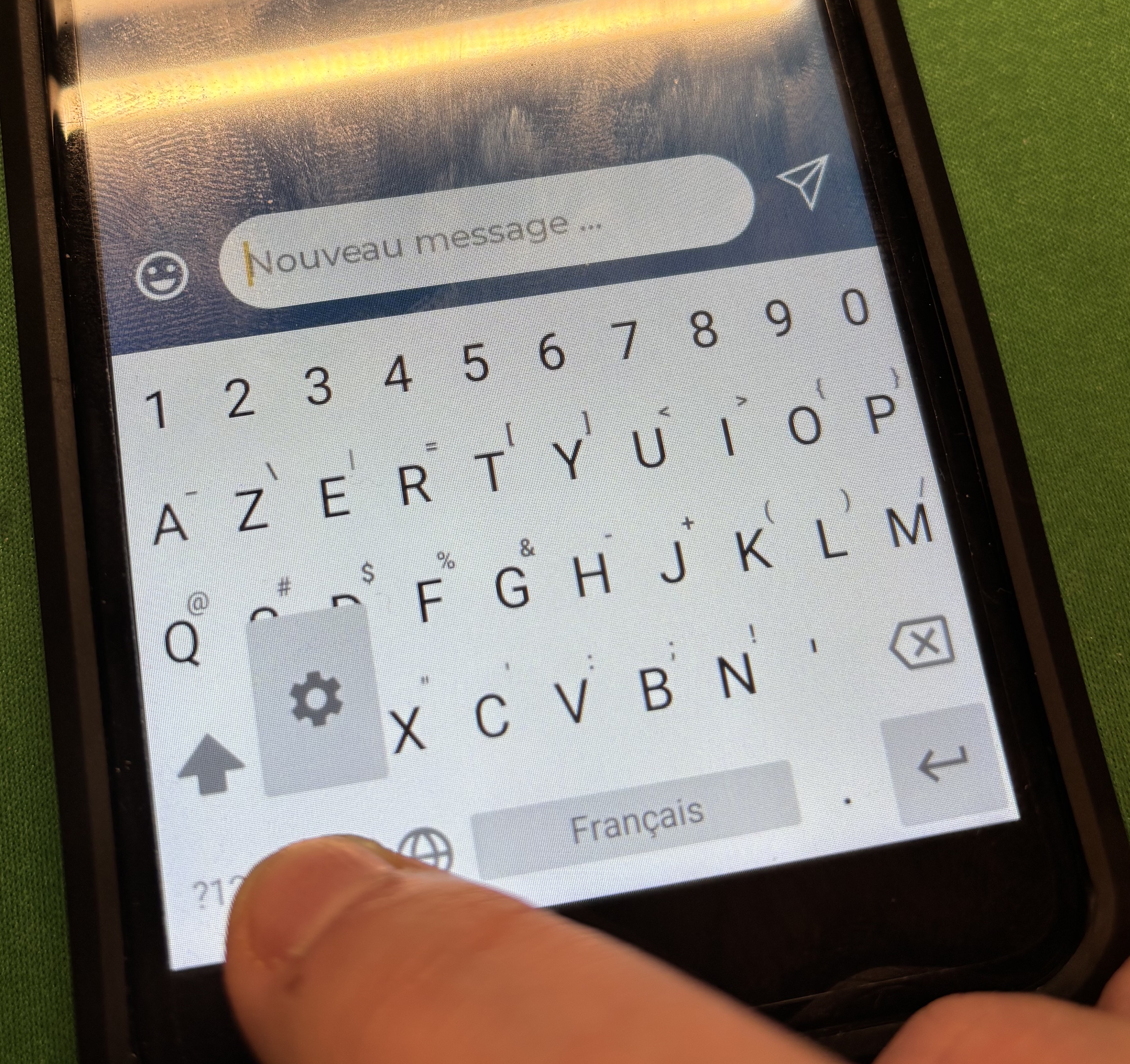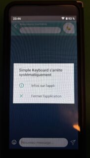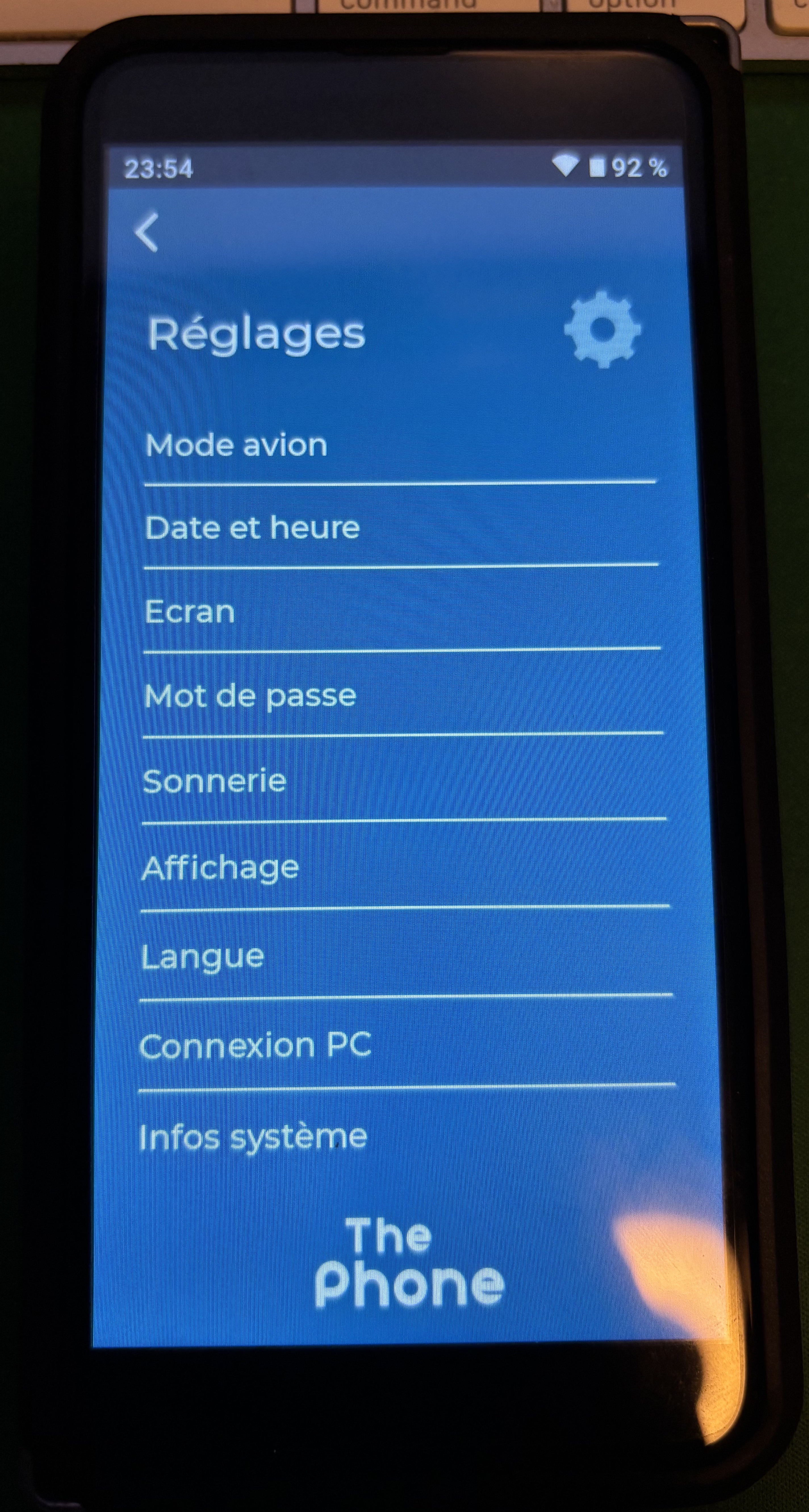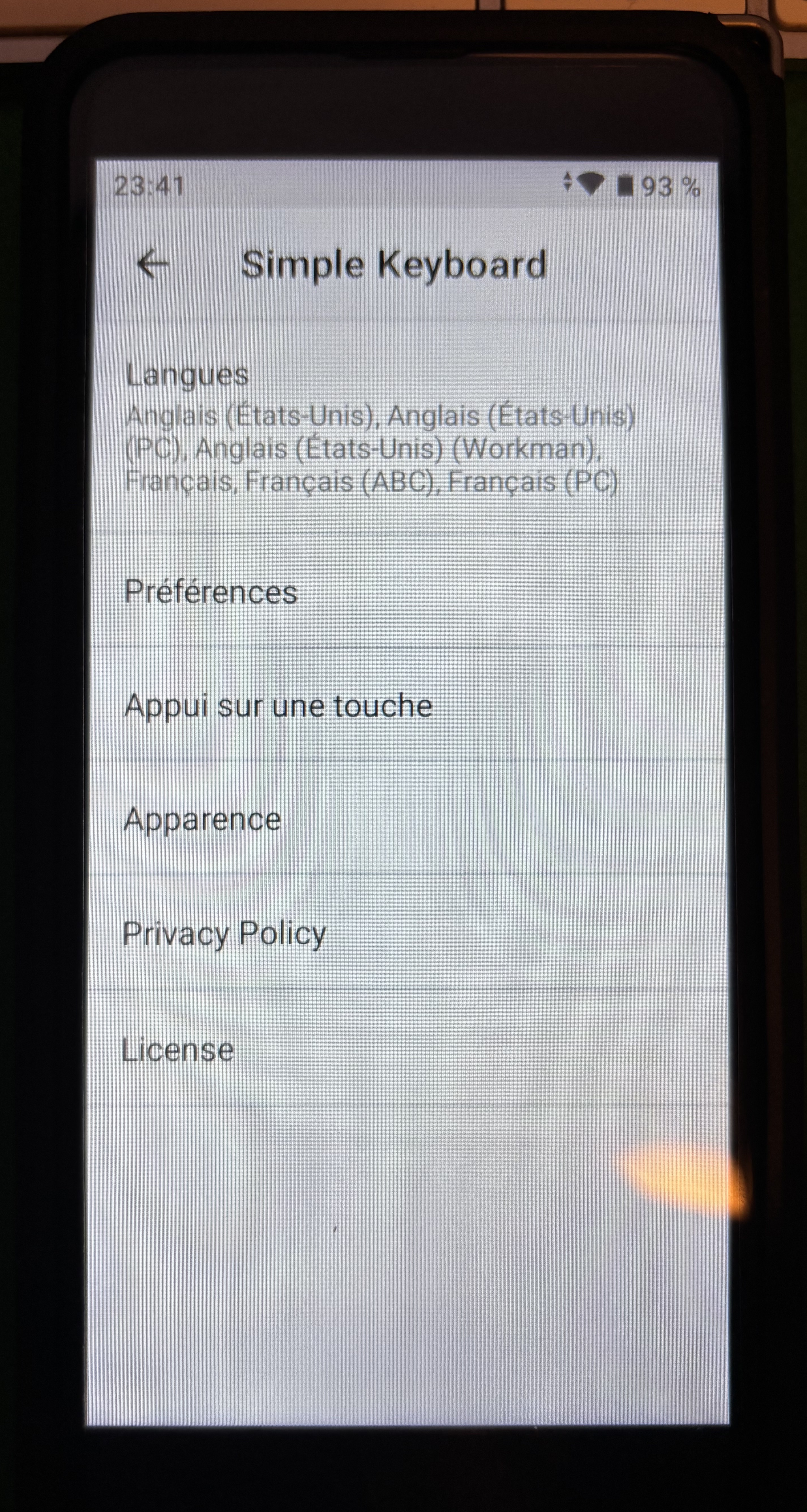 Ça, c’est le message dans les commentaires. J’ai donc allumé mon The Phone, qui avait été mis à jour. Cette mise à jour était une réponse à mon hack basique en 2024, et elle bloque la première méthode, tout en remettant le smartphone à zéro, d’ailleurs. Bref, de fait, presser quelques secondes la touche de virgule affiche une icône d’engrenage qui permet d’aller dans les réglages de Simple Keyboard, le clavier. On peut changer la couleur du clavier, modifier quelques réglages, etc. Rien de bien intéressant au premier abord, mais c’est un point d’entrée pour sortir de l’interface propriétaire.