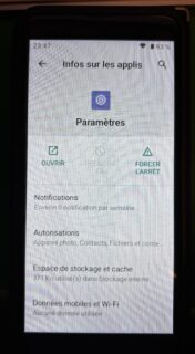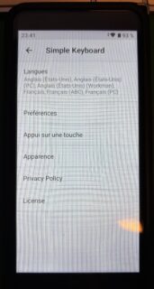 Deuxième étape, choisir License ou Privacy Policy. Si vous avez un navigateur installé (ce qui n’est pas le cas par défaut), ça va ouvrir une page web. Sans navigateur, on va juste revenir à l’interface. Mais il faut le faire une seconde fois… ce qui va planter le clavier. Et en cliquant sur Infos sur l’appli, on se retrouve dans les paramètres d’Android.