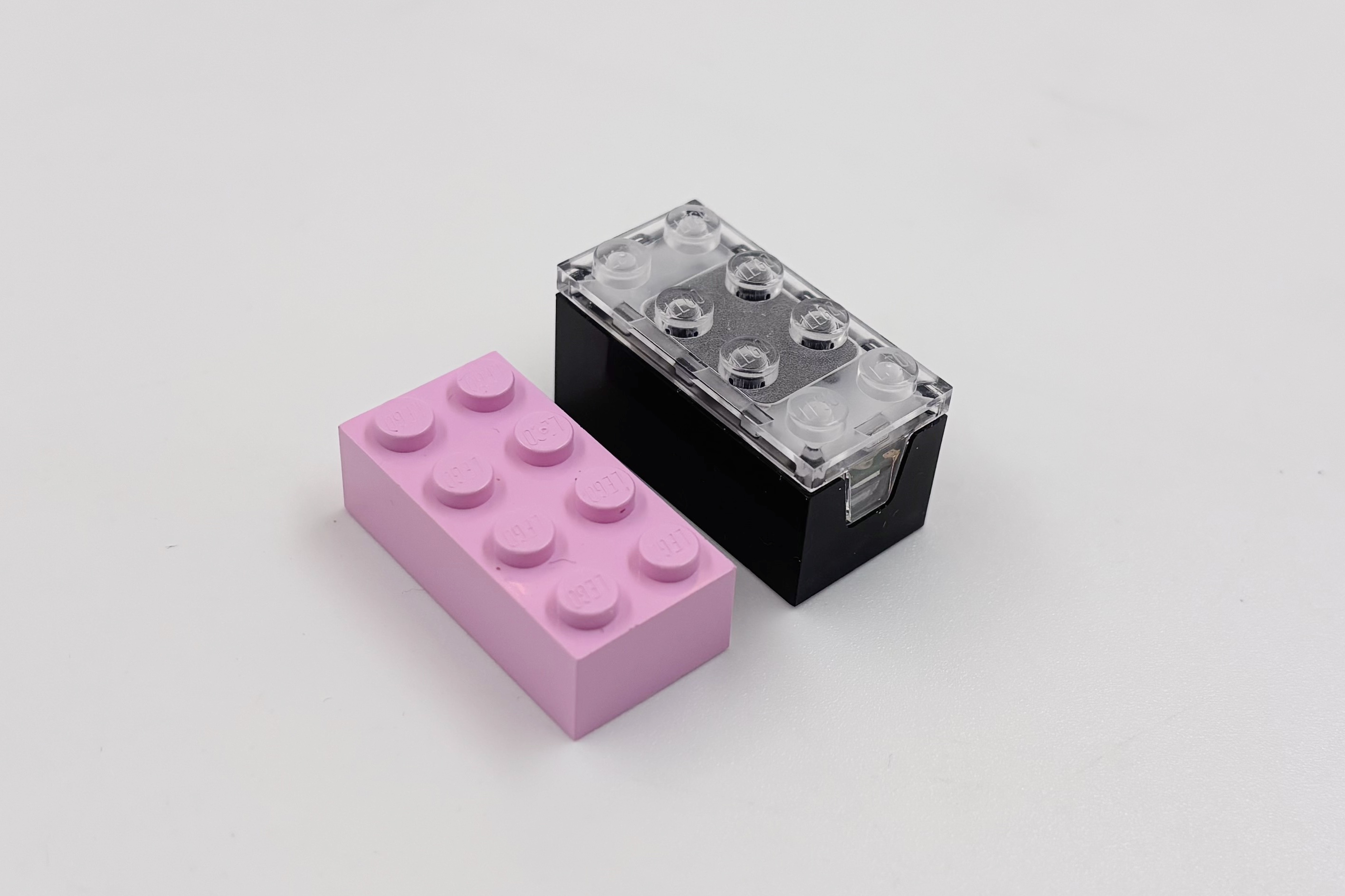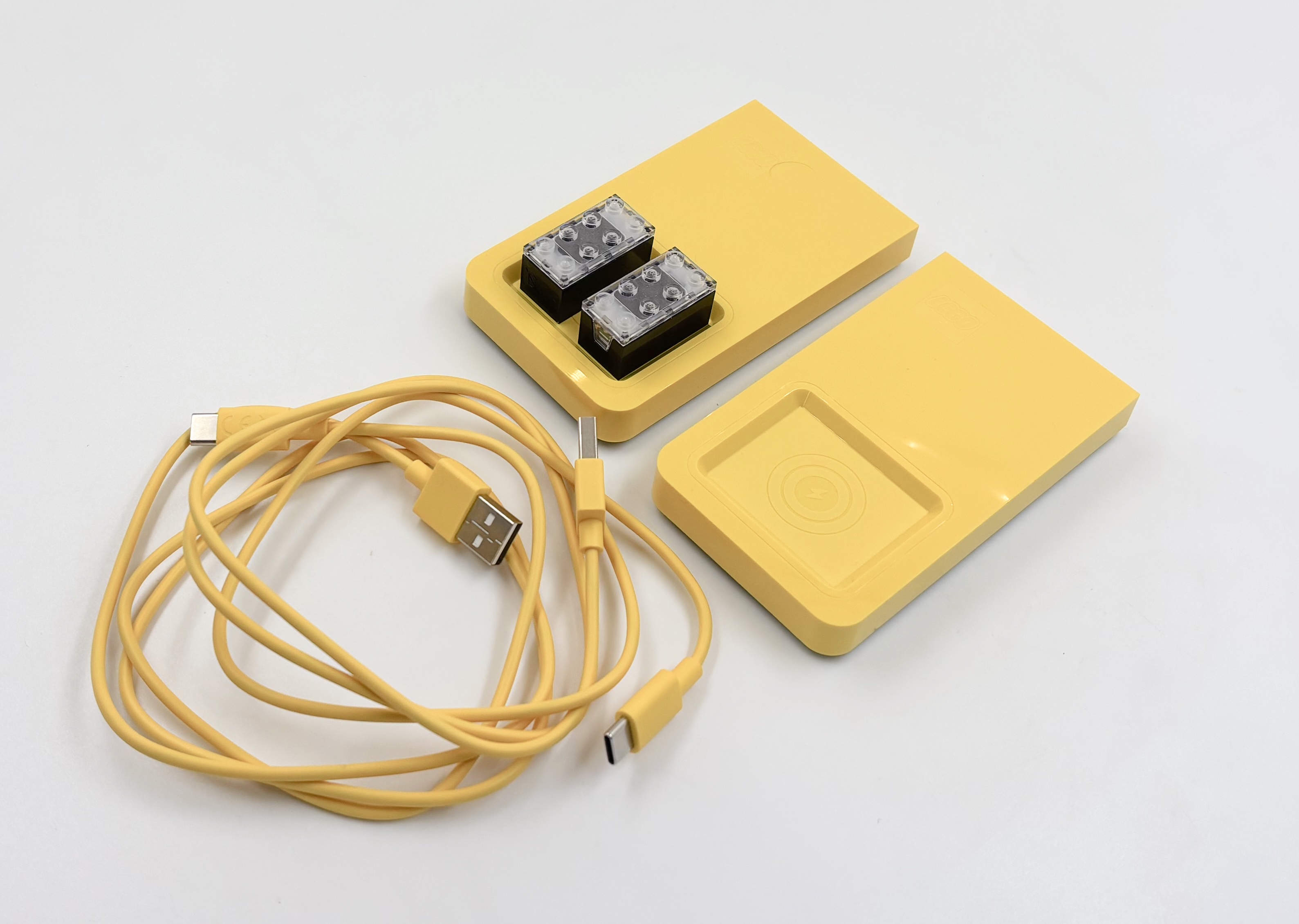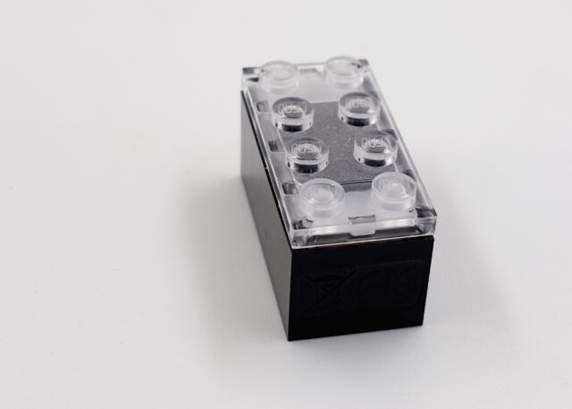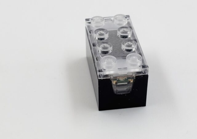Bon, commençons par la brique. C’est une 2×4 classique, mais elle fait cinq plates de haut (contre trois habituellement). Elle intègre une minuscule batterie (45 mAh) et la première chose à faire, c’est la charger. LEGO annonce deux heures de charge pour 45 minutes de jeu (bon, si un enfant arrive à tenir 45 minutes avec les bruits, ce qui ne sera pas le cas d’un adulte). LEGO fournit une base dans chaque set (c’est idiot) qui est un chargeur à induction propriétaire. Il n’est pas Qi (en tout ças, ça ne réagit pas) et s’alimente en USB-C. Il n’est pas visible par un ordinateur, et LEGO met dans la boîte un câble USB-A vers USB-C de 1 mètres (USB 2.0). Bonne nouvelle, ça fonctionne bien sur un adaptateur secteur USB-C compatible PD.