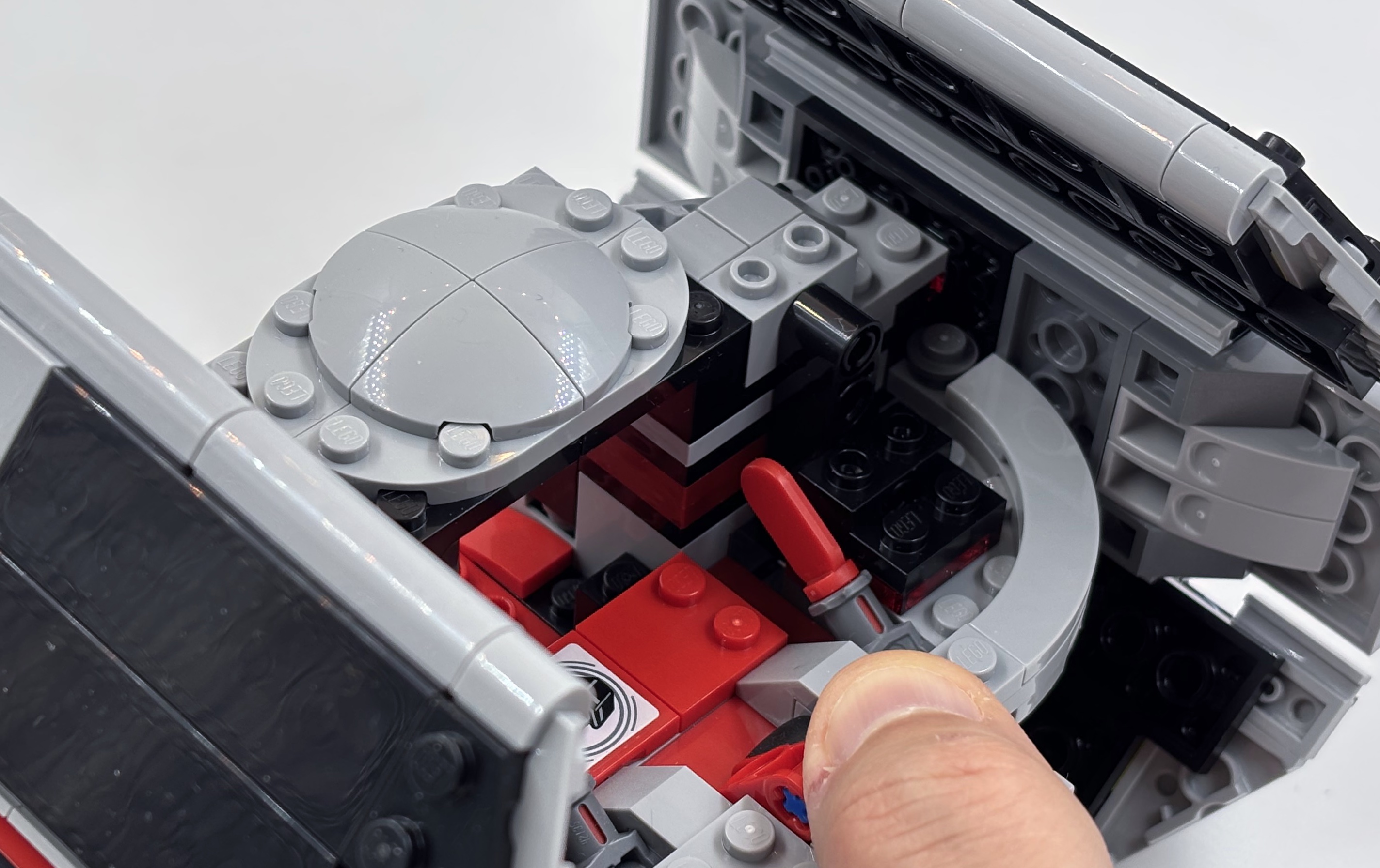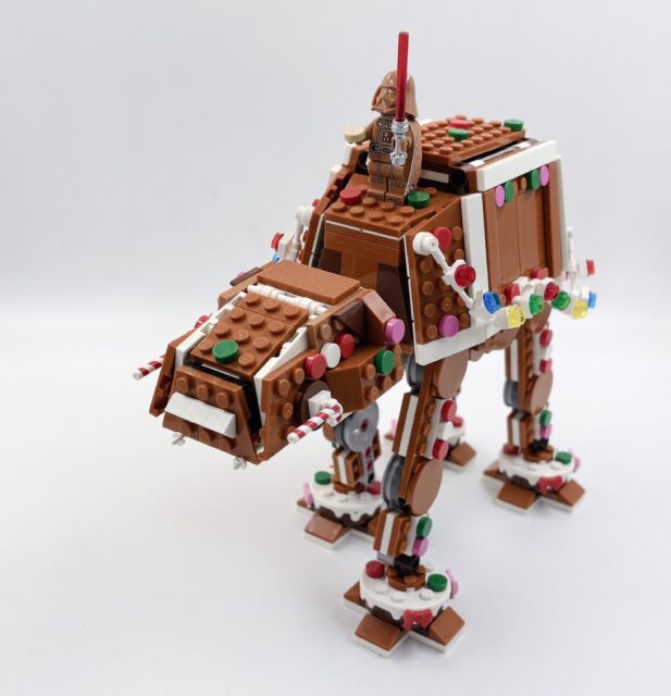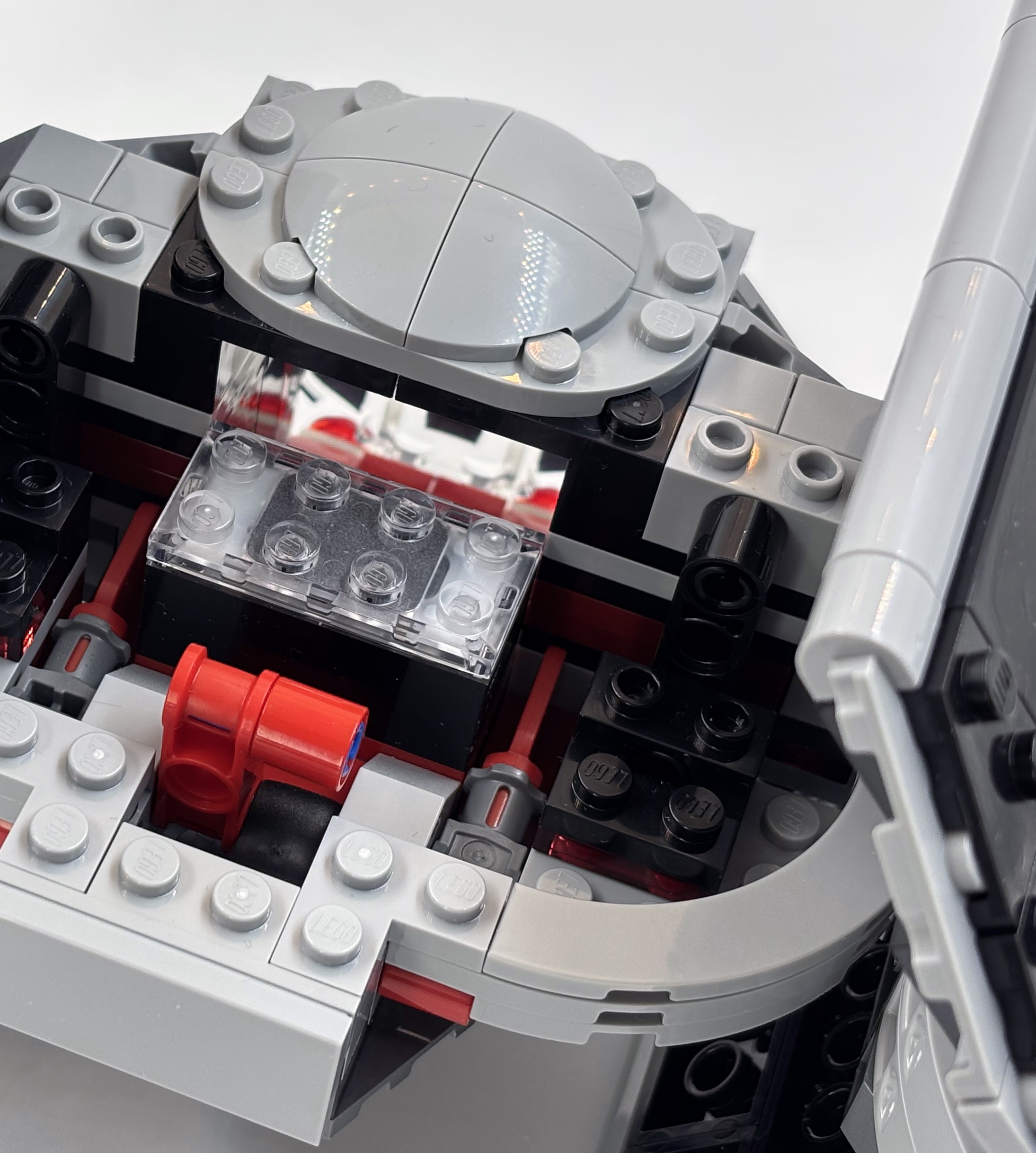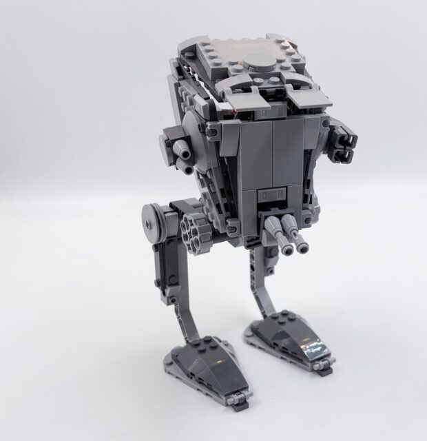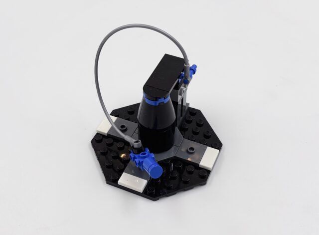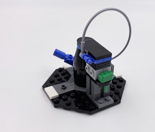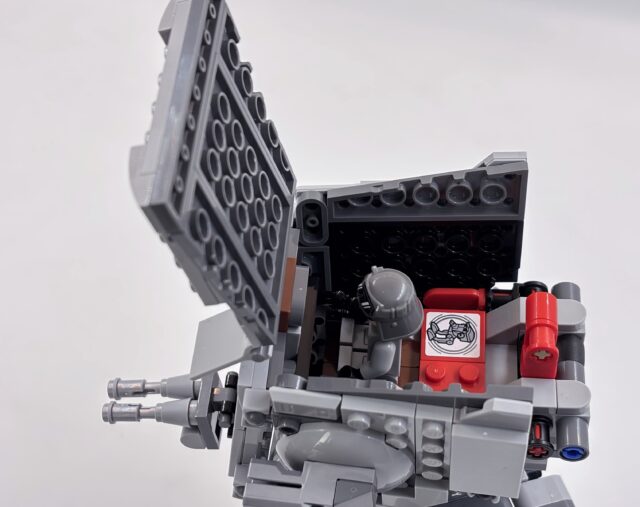 L’intégration nécessaire de la brique, qui doit être amovible, amène aussi un défaut : l’arrière est ouvert et assez vide, avec un levier et des pièces rouges. Ce n’est pas très esthétique. Sur le coup, j’ai eu bien plus de plaisir à monter le Game Boy ou l’AT-AT de Noël.
