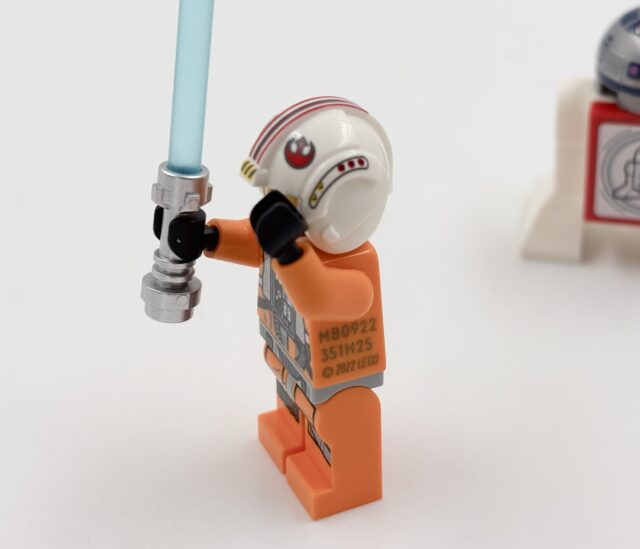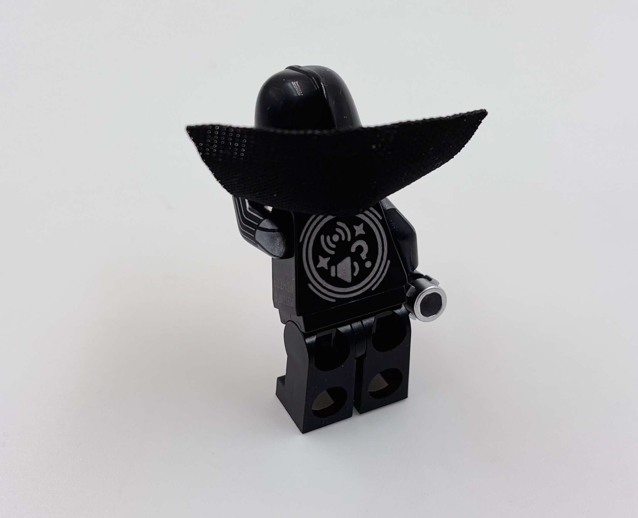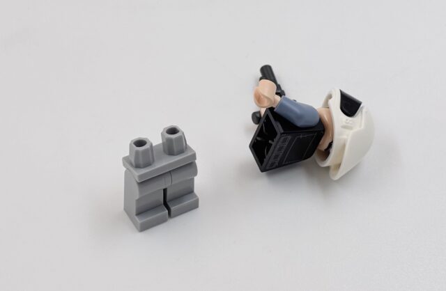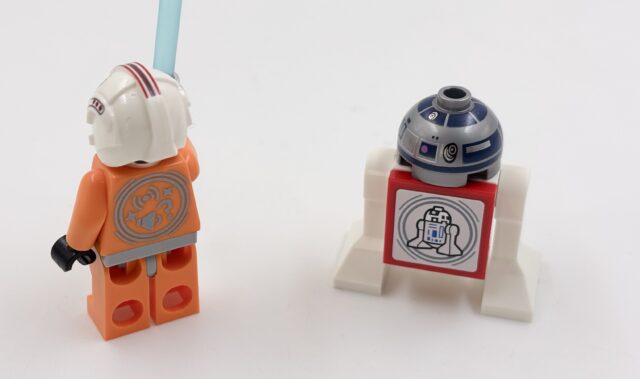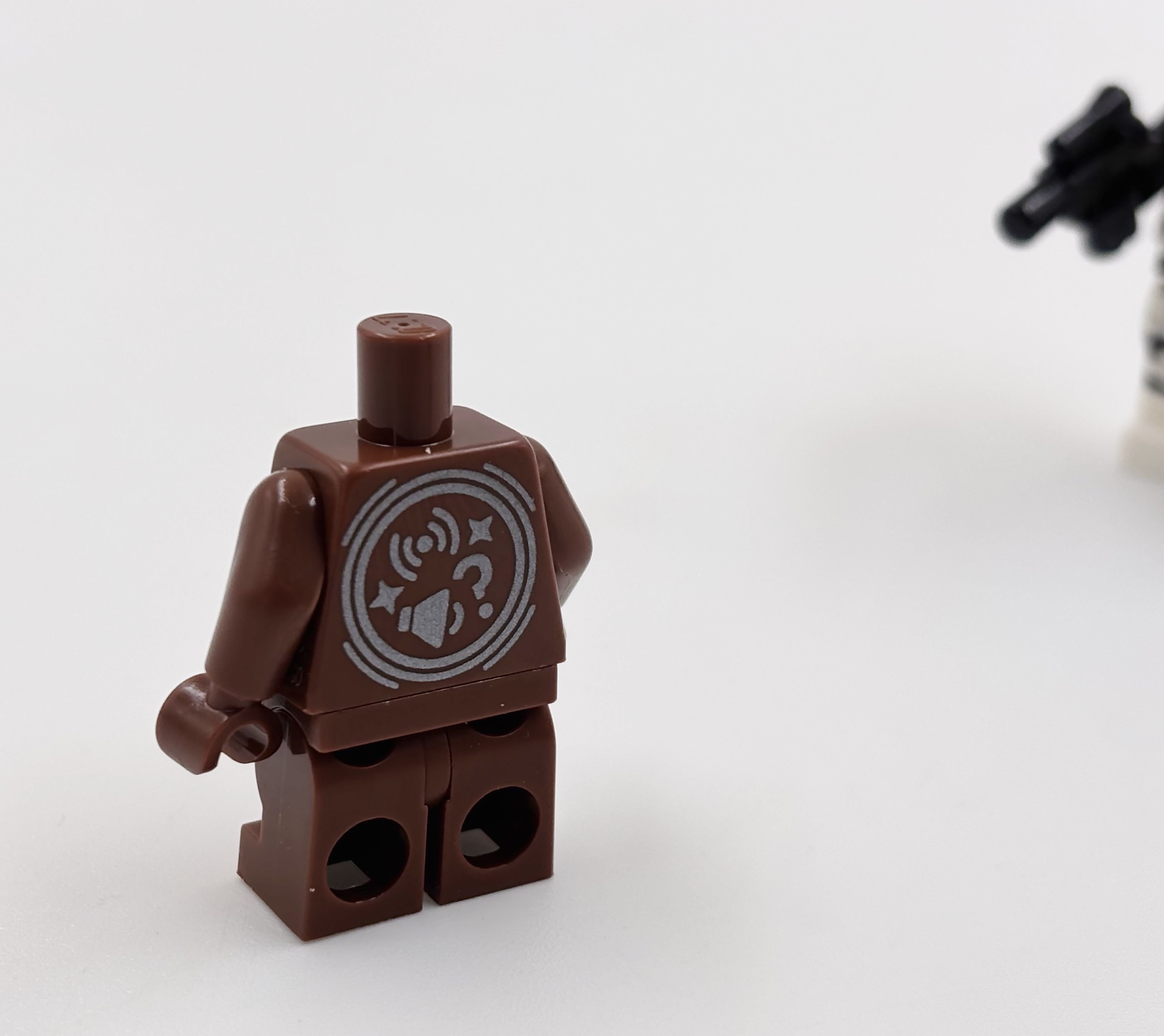 Sans même prendre en compte les interactions ridicules, les minifigs ont des défauts. D’abord, c’est idiot, toutes les minifigs d’un set ne réagissent pas. Si on prend l’AT-ST, l’Ewok a une puce NFC mais pas le pilote de l’AT-ST ni le Stormtrooper. Ensuite, celles qui réagissent ont un gros logo sur le dos (c’est moche, même si caché sur l’Ewok), un logo qui indique de ne pas les jeter sur le flanc et un code qui est probablement le numéro de série de la puce. Ensuite, les jambes sont solidaires du corps, ce qui est rare dans les minifigs.