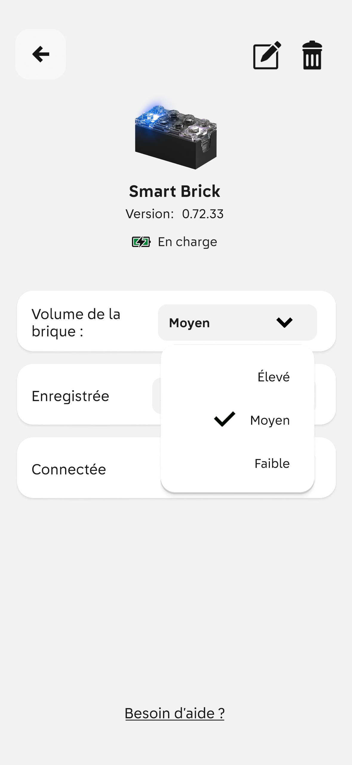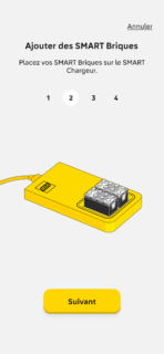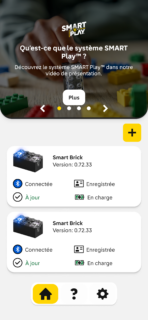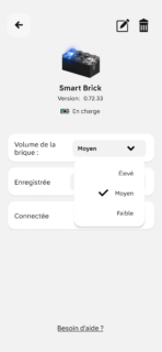 Enfin, la brique a une app. Alors, elle n’est absolument pas obligatoire et ne sert pas du tout à jouer, mais elle est juste là pour de la maintenance. On peut mettre à jour le firmware de la brique, vérifier le niveau de charge et (surtout) régler le volume sonore. C’est élevé par défaut, il est possible de mettre un niveau moyen ou faible. La connexion est médiocre : la brique doit être sur sa base et il faut la connecter manuellement (en tout cas, elle ne se sont jamais connectées automatiquement ici). Truc bête à noter : on peut avoir deux briques en même temps sur la base et LEGO n’a pas pensé à changer la couleur de la LED pour identifier une brique précise.