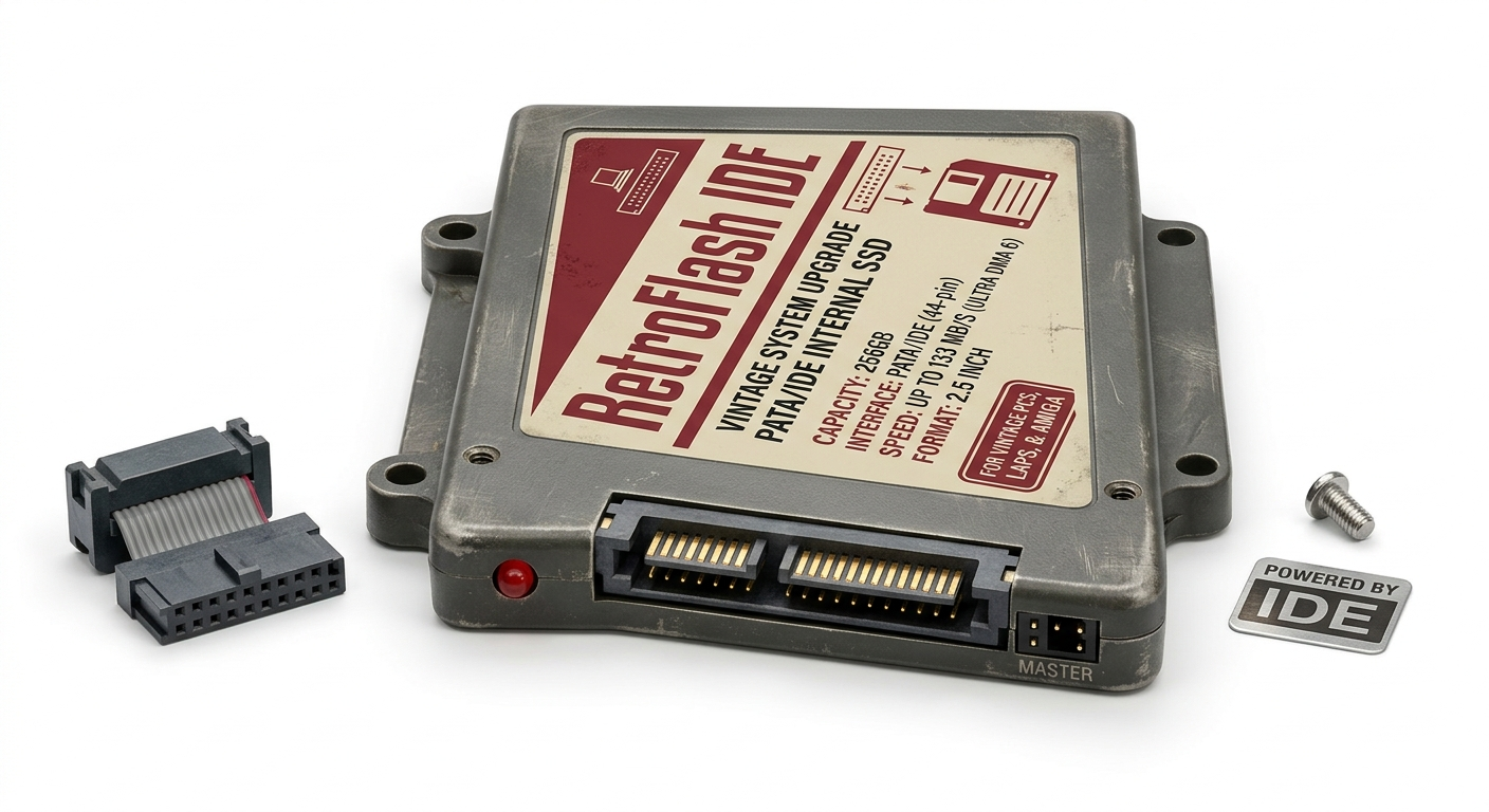 Cette fois, j’ai quand même accepté de regarder le RetroFlash IDE, un SSD au format 2,5 pouces présenté comme spécialement pensé pour les machines anciennes. L’idée est simple : proposer un stockage silencieux, peu gourmand, et surtout à peu près compatible avec les vieilles machines Apple qui n’aiment ni les gros disques, ni les timings trop modernes, ni les périphériques un peu exotiques.