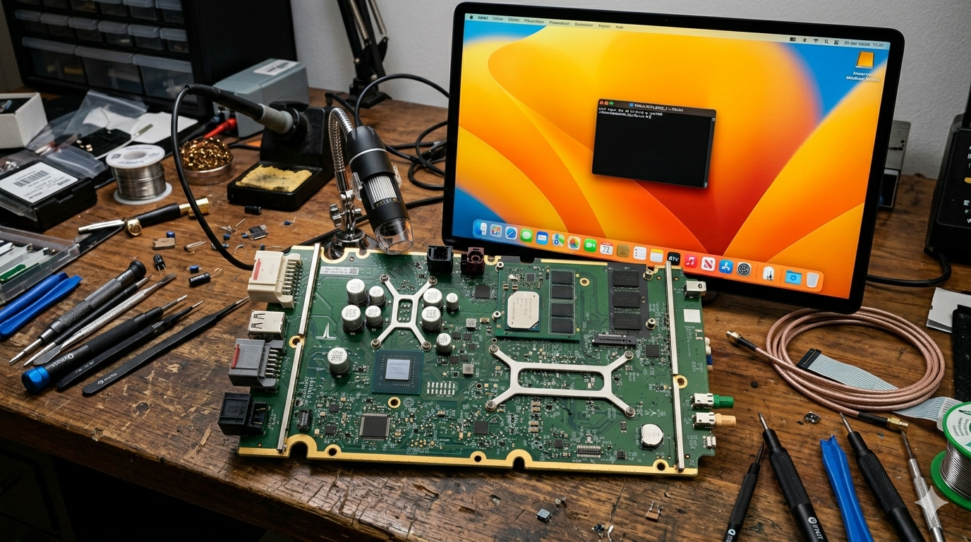 Le MCU (Media Control Unit) de la Model 3, c’est en gros un PC x86 déguisé en tableau de bord. À l’intérieur, on trouve un processeur Intel Core i3 de huitième génération, 8 Go de RAM, un SSD eMMC, et un écran tactile 15 pouces. Sur le papier, c’est tout à fait la définition d’un Hackintosh potentiel. Il m’a fallu quelques soirées pour cartographier les connecteurs, comprendre comment contourner la séquence de démarrage propriétaire de Tesla, et bricoler une alimentation 12 V correcte depuis un vieux bloc de PC. Pas insurmontable, mais pas trivial non plus.