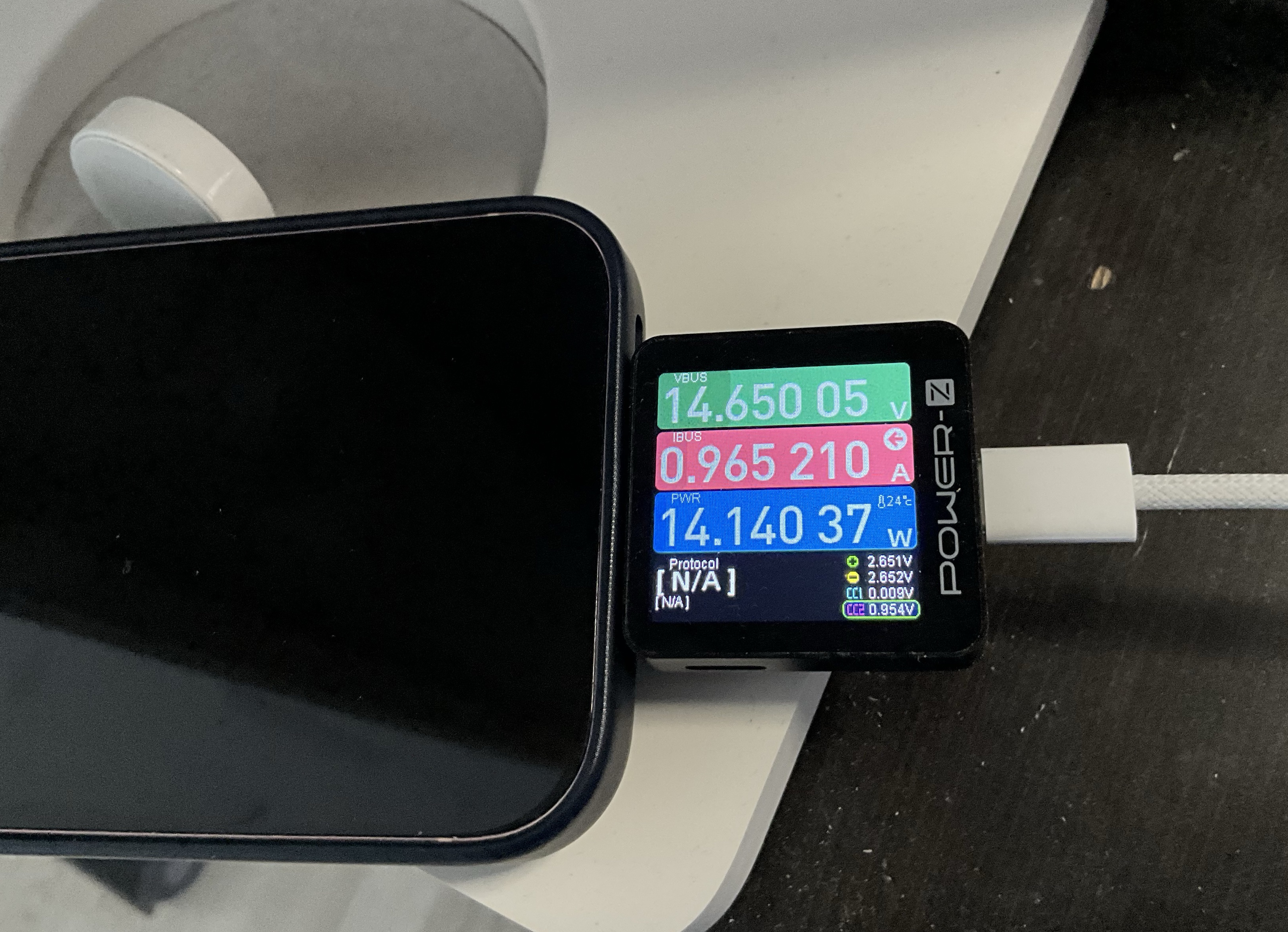 La seconde question, elle, est liée aux appareils Apple et à la compatibilité. De ce que j’ai pu voir, les appareils modernes – un MacBook Pro M5 Pro – fonctionnent toujours avec une tension de 14,5 V. Mon testeur USB n’affiche pas que c’est de l’USB-PD (mais un simple N/A), mais ça fonctionne encore. C’est aussi le cas des iPhone : mon iPhone 15 passe à 14,5 V sur ce chargeur (la capture montre environ 14 W parce que l’iPhone était chargé).