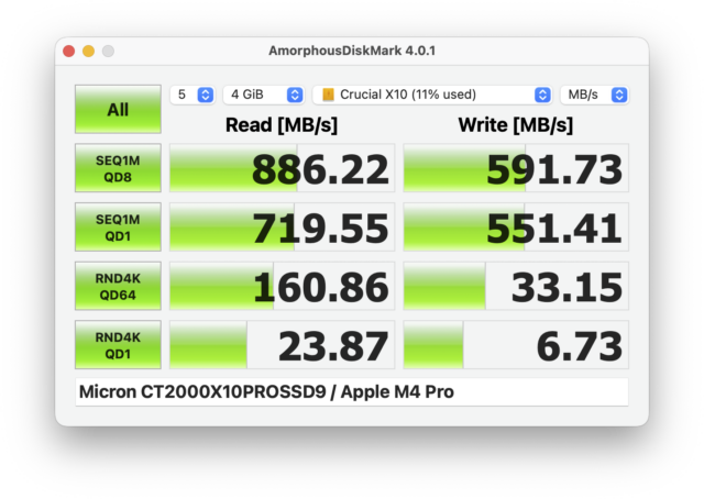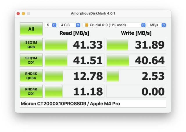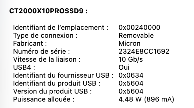 Après, le test est assez court : avec mes autres adaptateurs, il y a un sens. Avec l’adaptateur de Satechi, il n’y en a pas. Je ne sais pas comment la marque fait, il y a probablement une détection en interne, mais ça fonctionne. Au passage, l’adaptateur est bien compatible 10 Gb/s, même si les prises USB-A à 10 Gb/s sont rares : la majorité des prises que vous allez rencontrer se limite à 5 Gb/s. Je dois quand même noter que l’adaptateur noir en photo, un Crucial, évite le problème si vous avez un câble Crucial : il y a une encoche dans l’adaptateur qui force le câble Crucial dans le bon sens (il a une excroissance adaptée). Mais avec un autre câble, les deux sens sont possibles.