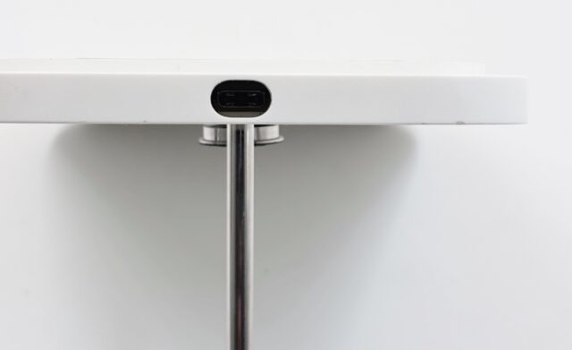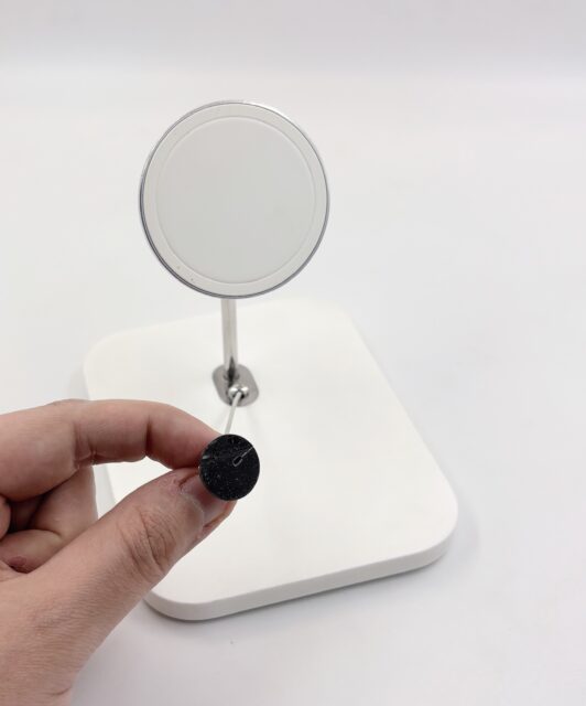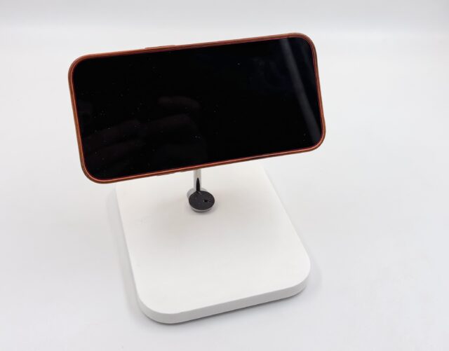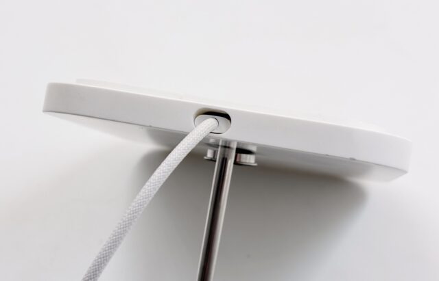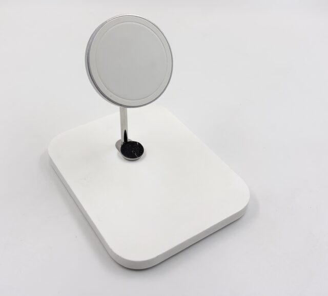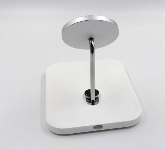 Le support MagSafe, donc. Je l’avais vu passer plusieurs fois, parfois très cher. C’est un support en plastique (avec une base assez lourde), un pied en métal et une bobine MagSafe. Il y a un système antivol intégré, avec un câble rétractable.