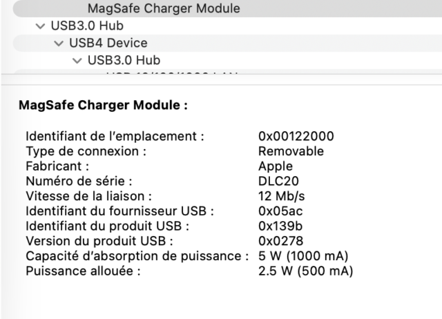 Pour l’alimentation, il faut un câble USB-C avec une prise qui n’est pas trop large : c’est assez ajusté. Ça passe bien avec un câble tressé Apple, par exemple. Une fois relié à un Mac, il communique, donc le firmware peut probablement être mis à jour.