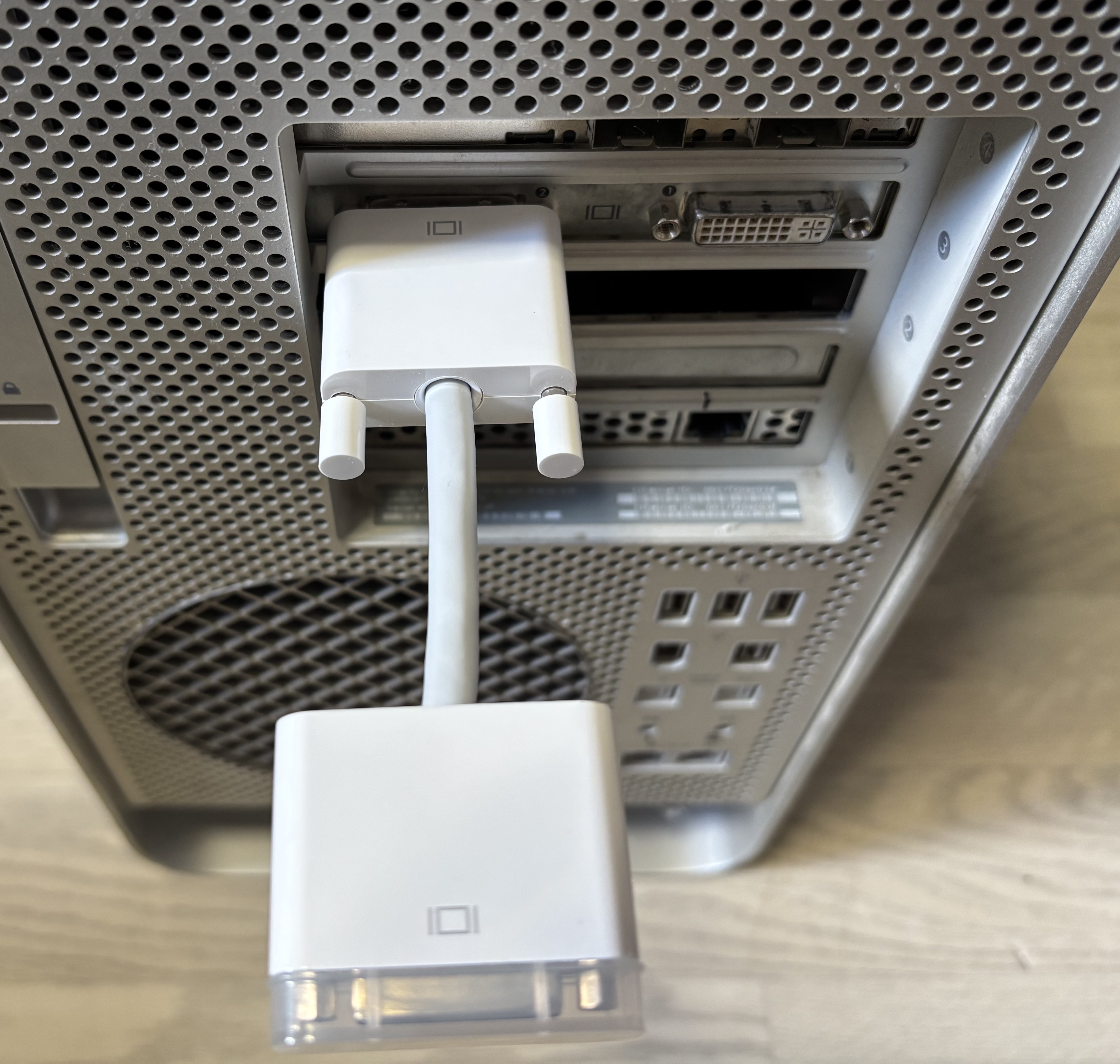En fait, il a une utilité très précise, qui vient d’un choix d’Apple sur les Power Mac G5 et les premiers Mac Pro. Sur ces machines, les cartes graphiques sont assez enfoncées dans le boîtier, alors que dans les boîtiers de PC, il y a souvent de l’espace autour des prises. L’adaptateur est surtout utile pour la seconde prise DVI de certaines cartes graphiques : elle est très proche des montants du boîtiers et certains câbles DVI un peu trop larges ne passent tout simplement pas. C’est un problème qui existe encore en 2026 : les prises USB-C des appareils Apple sont très proches l’une de l’autre, par exemple. Ou si vous avez une coque sur un iPhone : l’espace pour la prise USB-C est restreint et seuls les câbles avec une prise assez fine entrent.