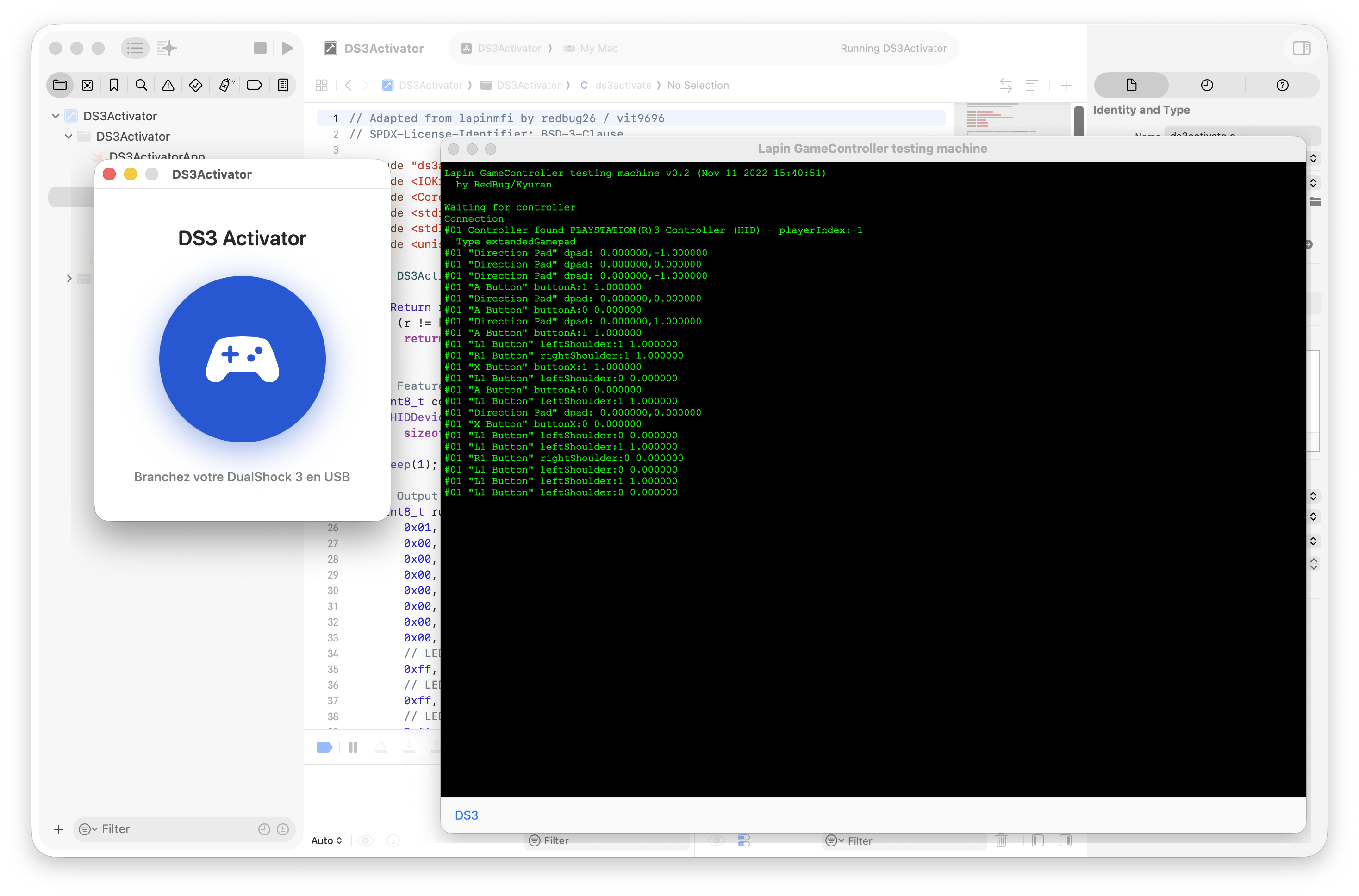 Pendant longtemps, j’ai utilisé un truc basique en ligne de commande compilé manuellement pour activer la manette, et la DualShock 3 est même reconnue nativement par les systèmes récents une fois activée. Un lecteur m’avait fait un petit logiciel de test pour les manettes, qui intègre le code d’activation, d’ailleurs. Ici, j’ai juste demandé à Claude un programme en Swift qui affiche un gros bouton, détecte la manette et l’active à la demande. Et ça fonctionne.