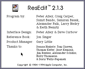 Ensuite, il faut aller dans le menu  et choisir About ResEdit tout en pressant command et option. Une fenêtre avec des crédits va apparaître. Sans les deux touches, vous verrez juste l’image du clown.