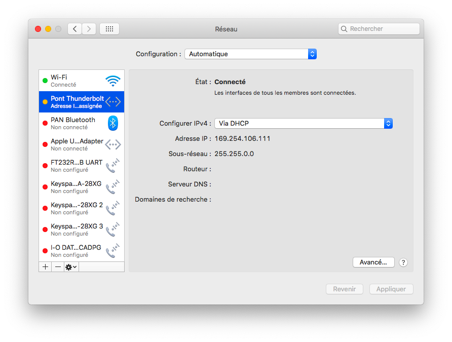 J’ai voulu aussi tester l’IP over FireWire, mais j’en reparlerais, je pense. Ça ne fonctionne évidemment pas sous macOS Tahoe, mais ça ne marche pas non plus sous macOS Sequoia : la liaison IP n’apparaît pas.